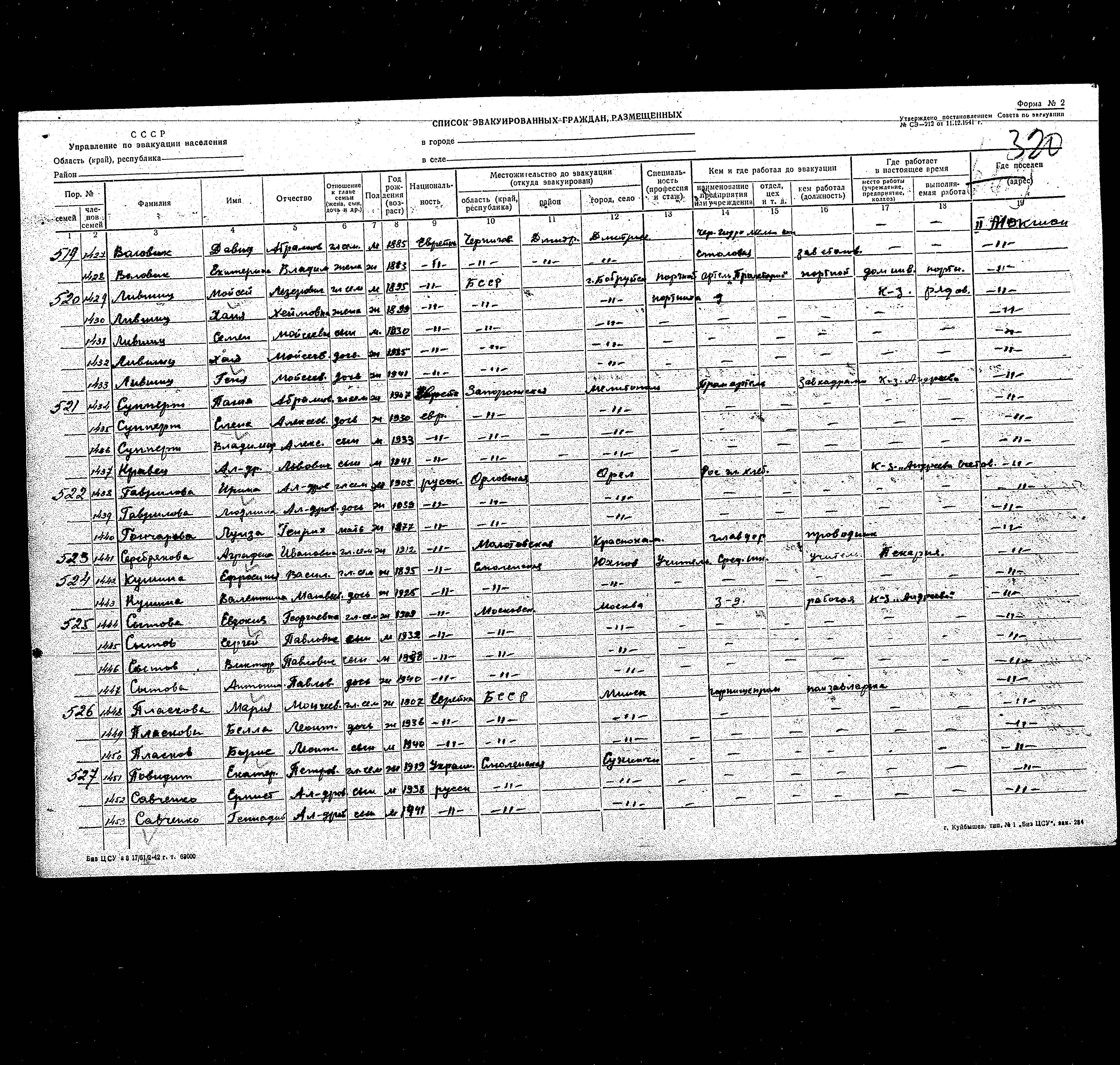David Volovik was born, 1885 to Abram. He was married to Yekaterina. Prior to WWII he lived in Dmitriyevka, Ukraine (USSR). During the war he was in Mokshan, Russia (USSR). David was registered following the evacuation/ in the interior of the Soviet Union.