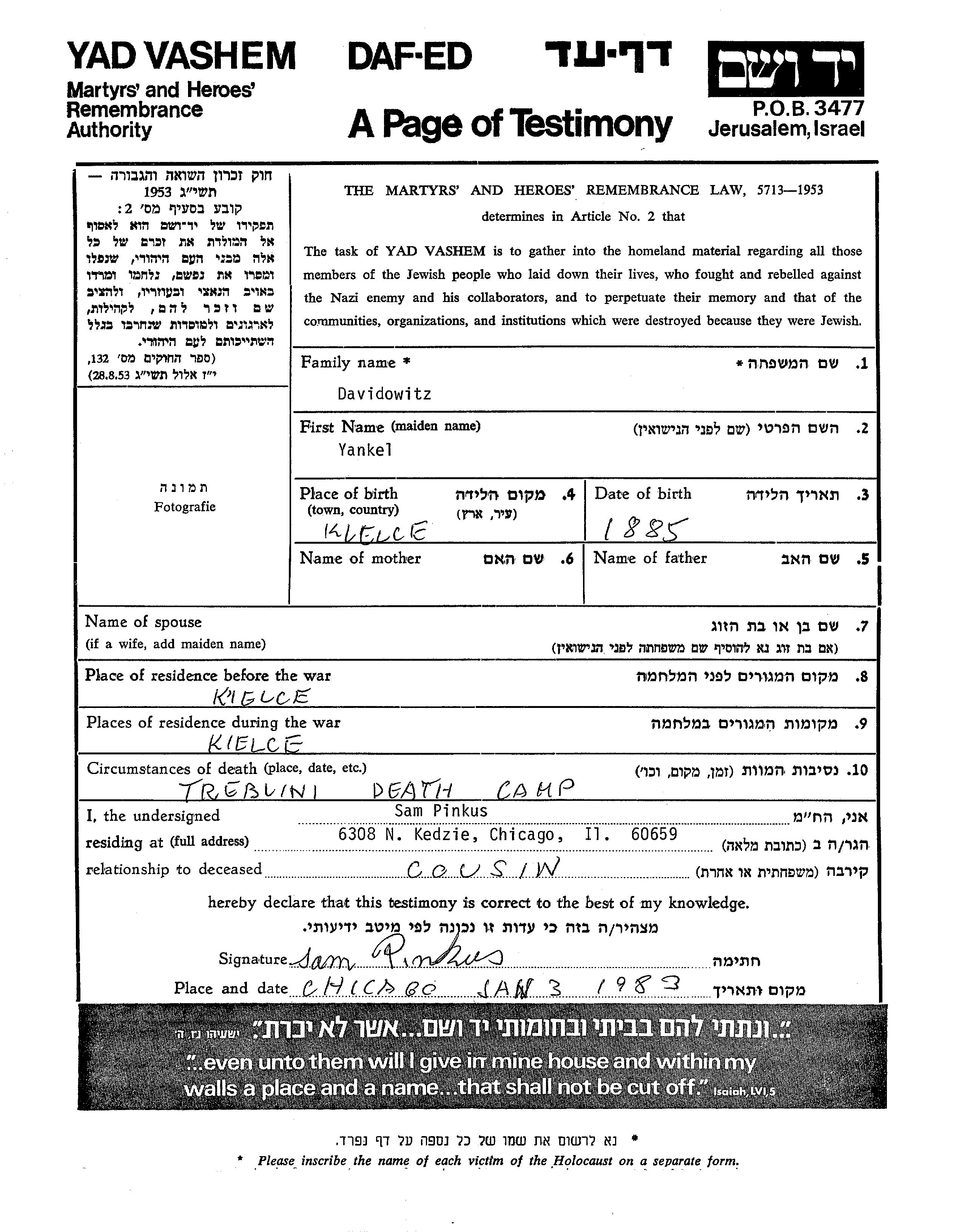 Davidowitz Yankel 1885 Kielce, Poland Page of Testimony