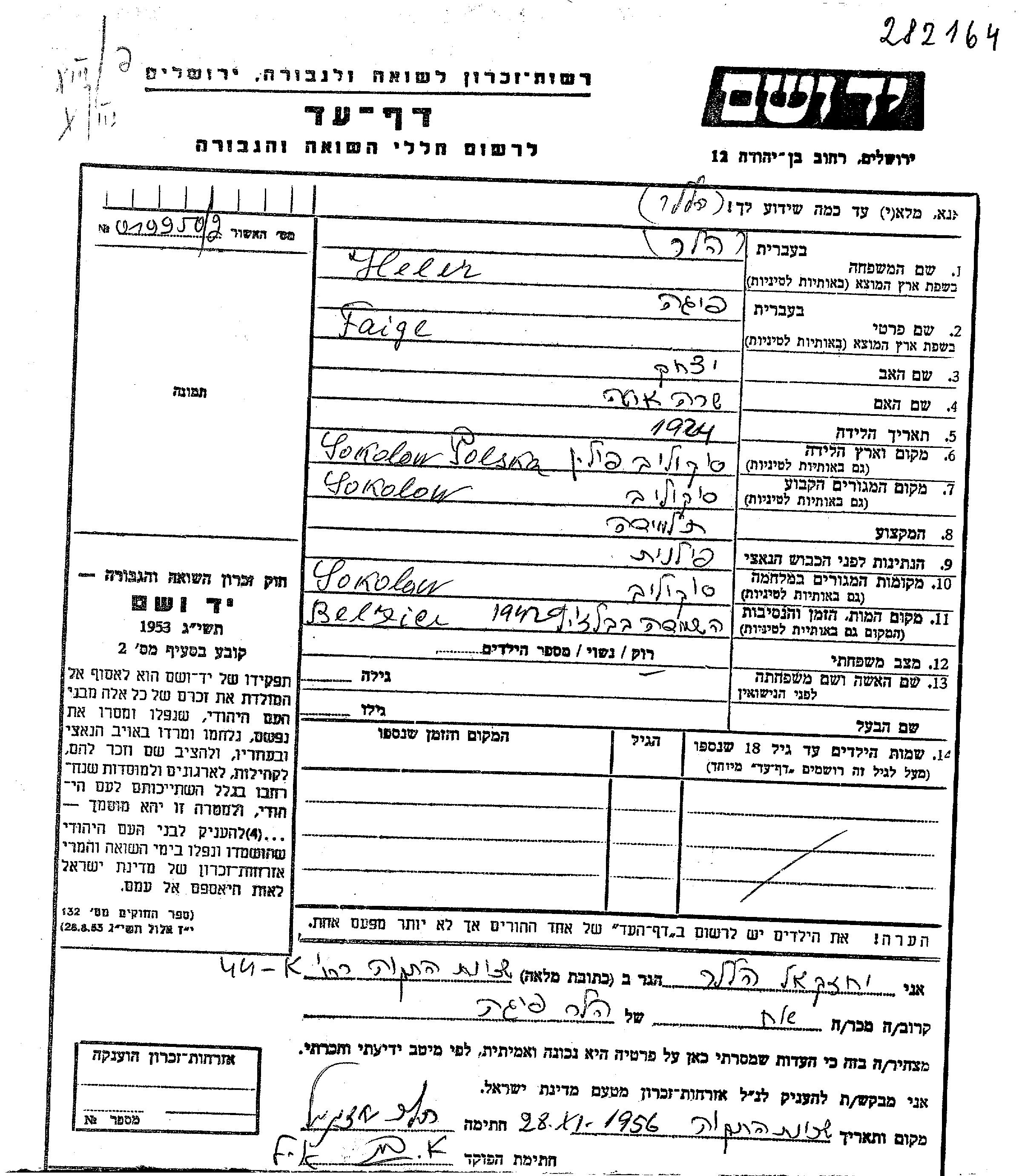 Faige Heler was born in Sokolow Malopolski, Poland, 1924 to Yitzkhak and Sara Ita. She was a pupil and single. Prior to WWII she lived in Sokolow Malopolski, Poland. During the war she was in Sokolow Malopolski, Poland. Faige was murdered in the Shoah. Place of death: Belzec, Poland, 1942.