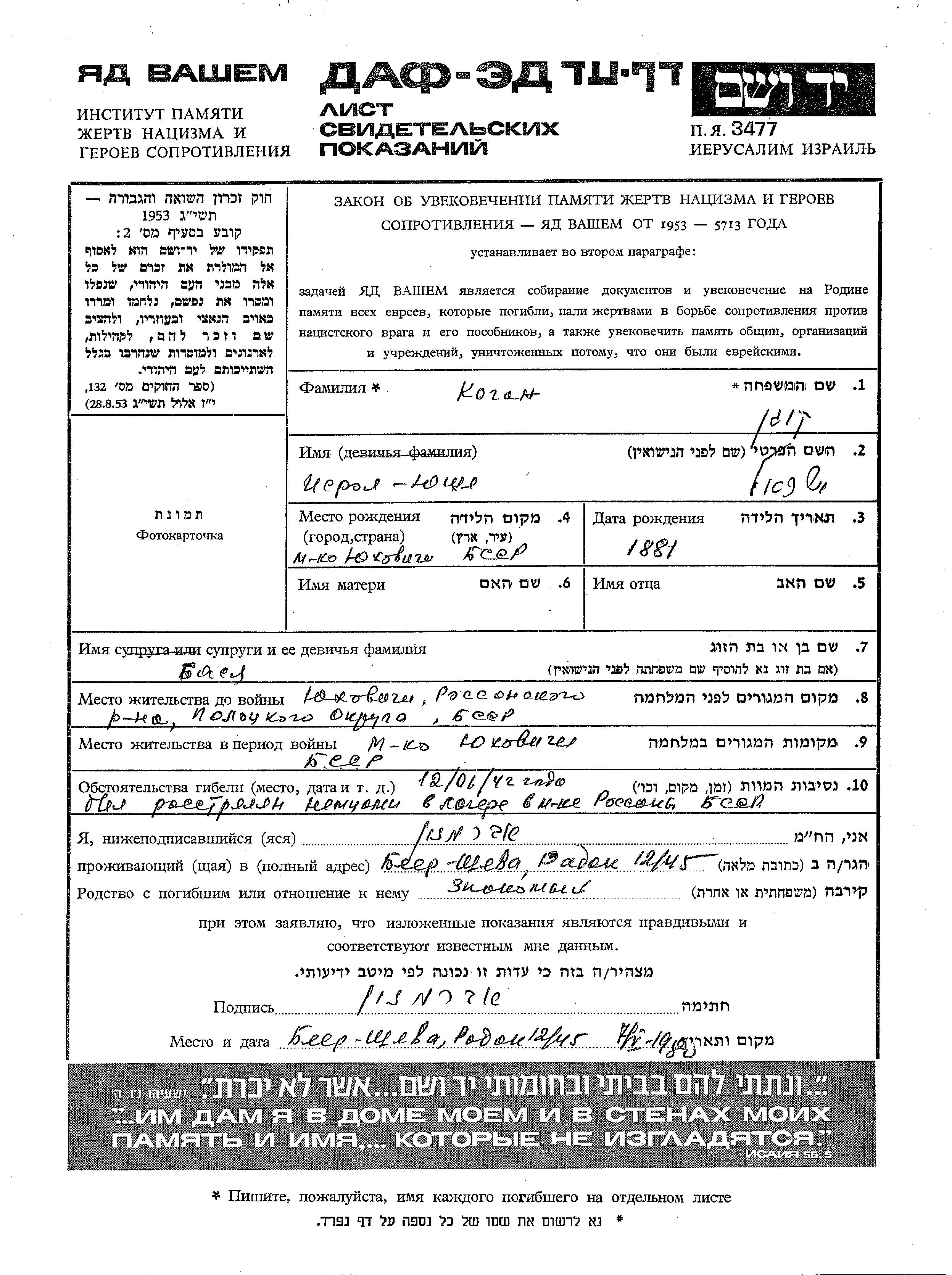 Isrol Yushl Kogan was born in Yukhovichi, Belorussia (USSR), 1881. He was married to Basya. Prior to WWII he lived in Yukhovichi, Belorussia (USSR). During the war he was in Yukhovichi, Belorussia (USSR). Isrol Yushl was murdered in the Shoah. Place of death: Rossony, Belorussia (USSR), 12/01/1942.
