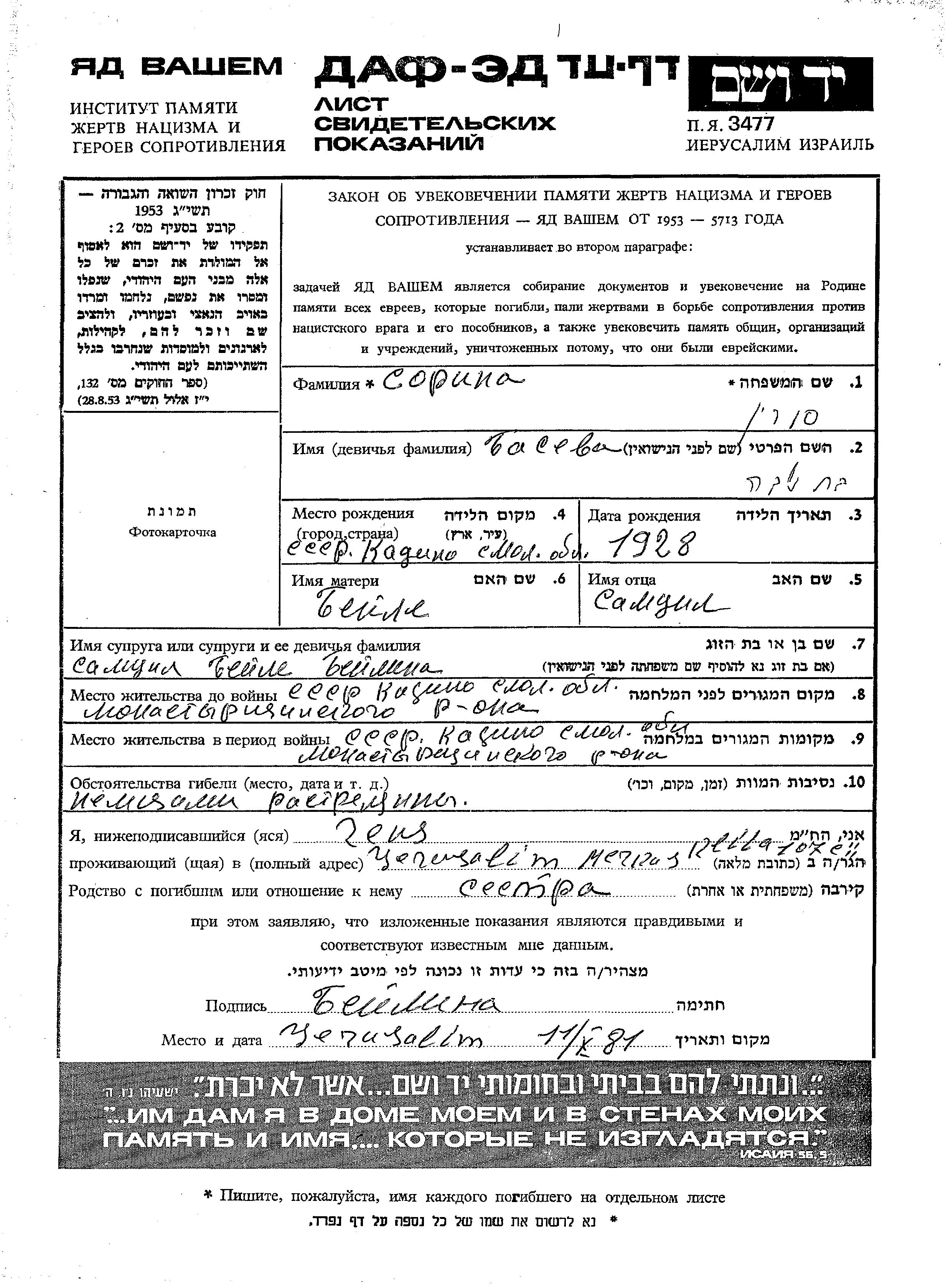 Sorin Baseva 1928 Kadino, Russia (USSR) Page of Testimony