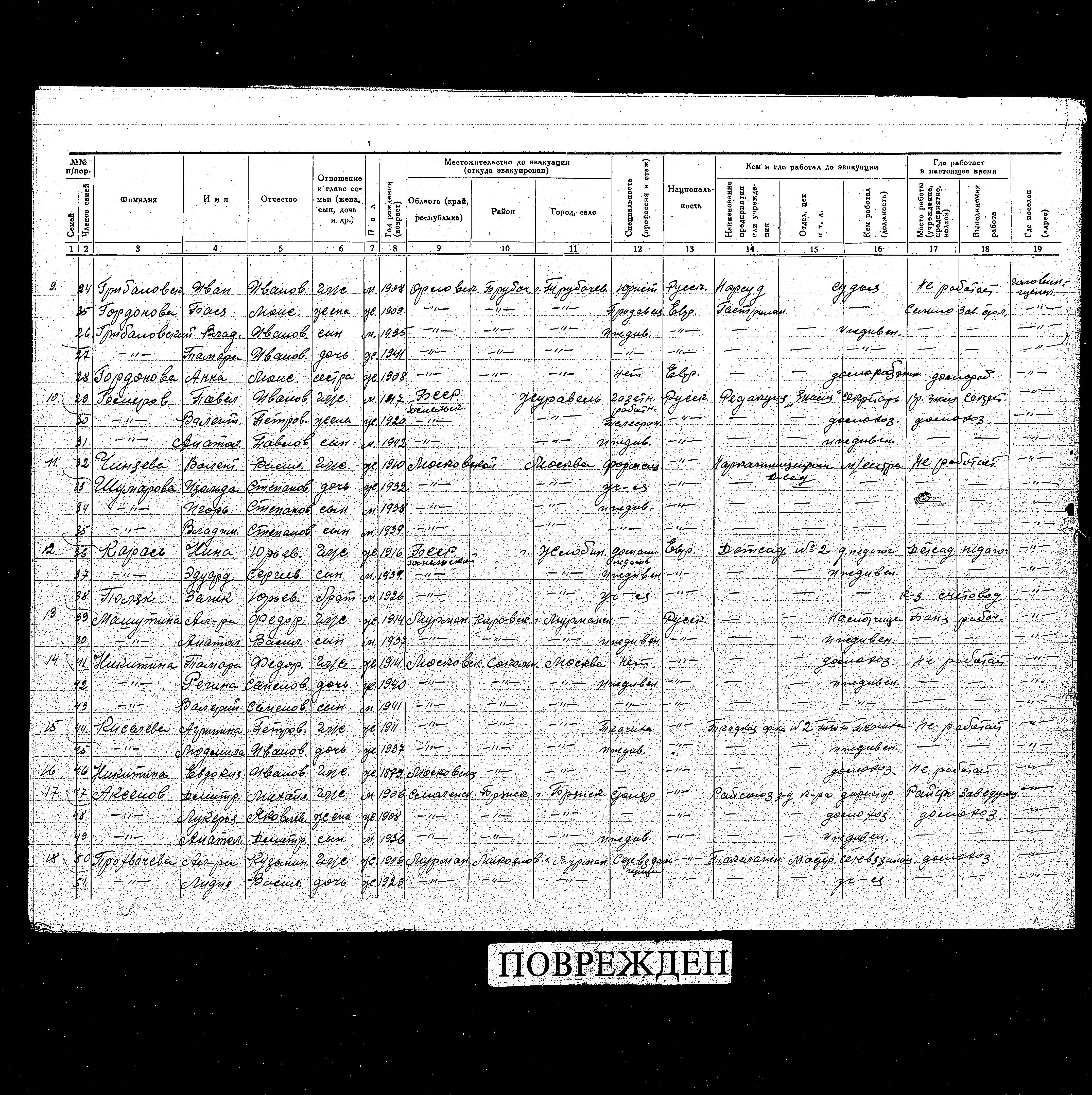 Tamara Gribalovskaya was born, 1941 to Ivan and Basya. She was baby. Prior to WWII she lived in Trubchevsk, Russia (USSR). During the war she was in Golovinshchino, Russia (USSR). Tamara was registered following the evacuation/ in the interior of the Soviet Union.