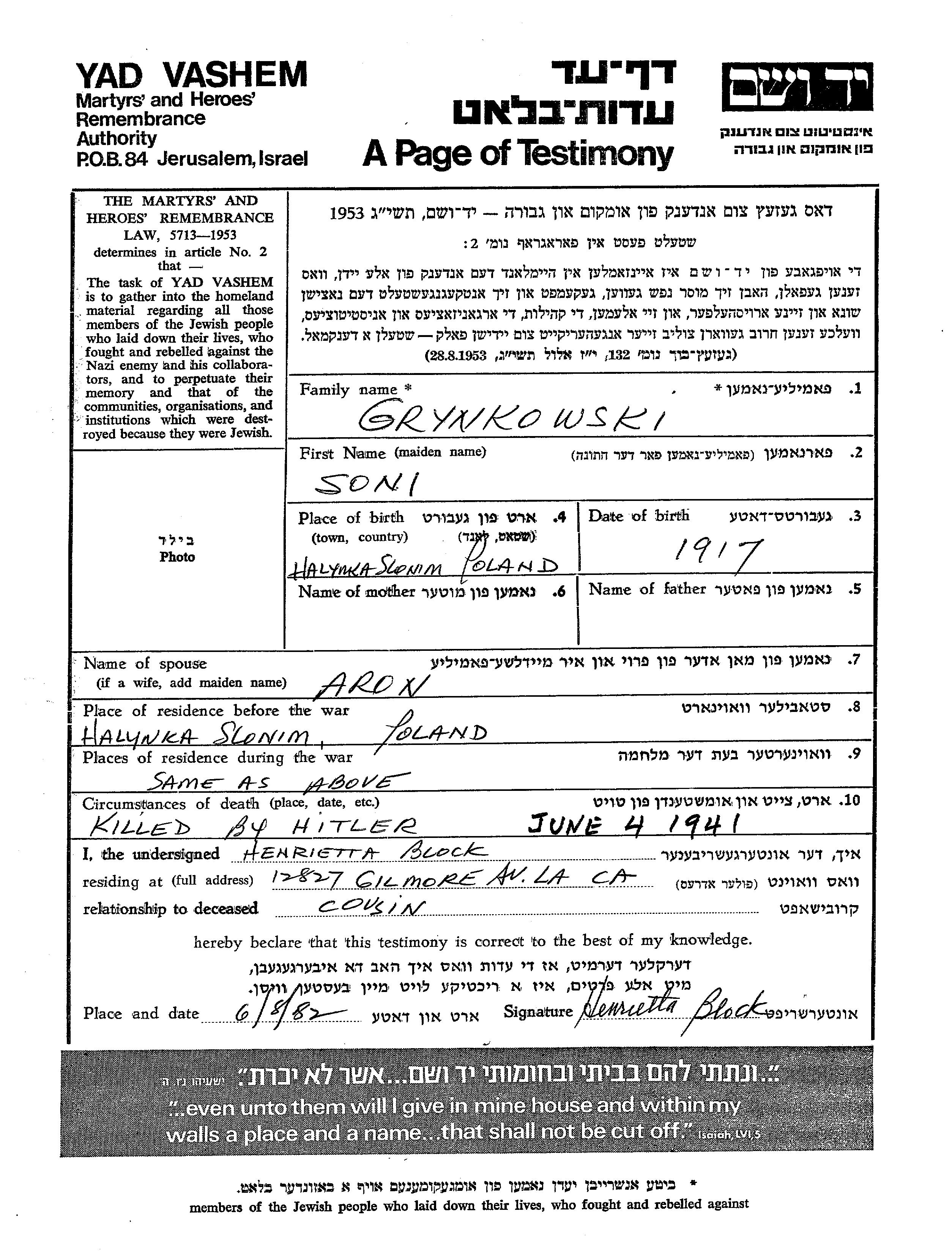Soni Grynkowski was born in Halynka, Poland, 1917. She was married to Aron. Prior to WWII she lived in Halynka, Poland. During the war she was in Halynka, Poland. Soni was murdered in the Shoah. Place of death: unknown, 04/06/1941.