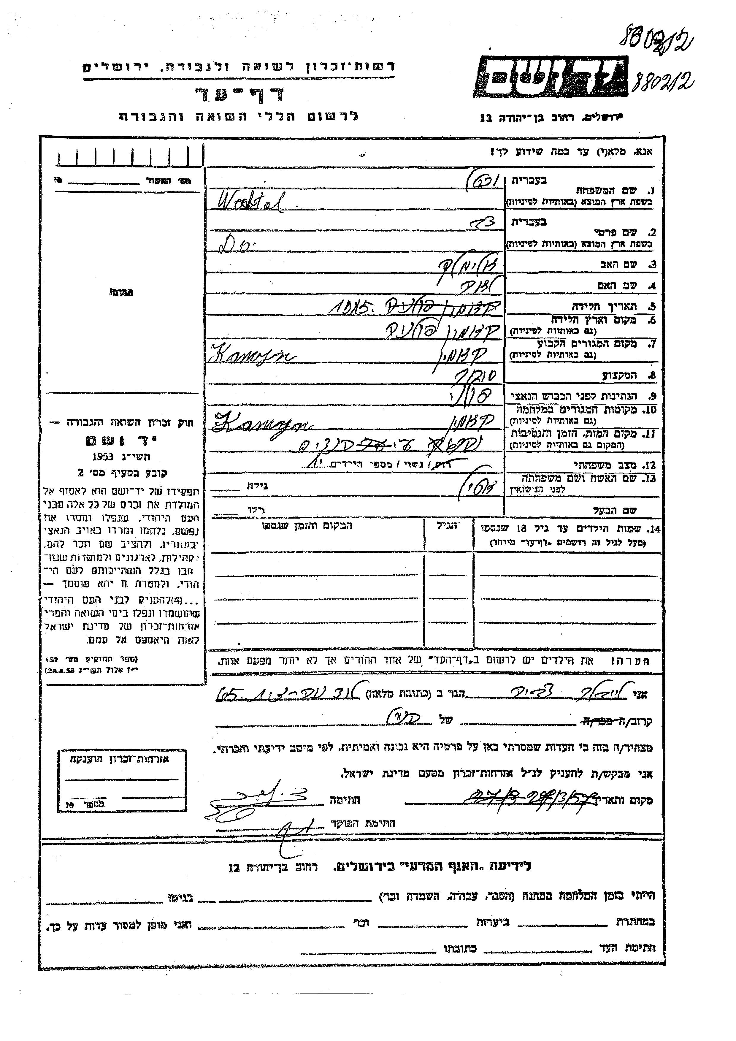 Do Dov Wachtel was born in Kamien, Poland, 1915 to Elimelekh and Lea. He was a merchant and married to Etil. Prior to WWII he lived in Kamien, Poland. During the war he was in Kamien, Poland. Do Dov was murdered in the Shoah.