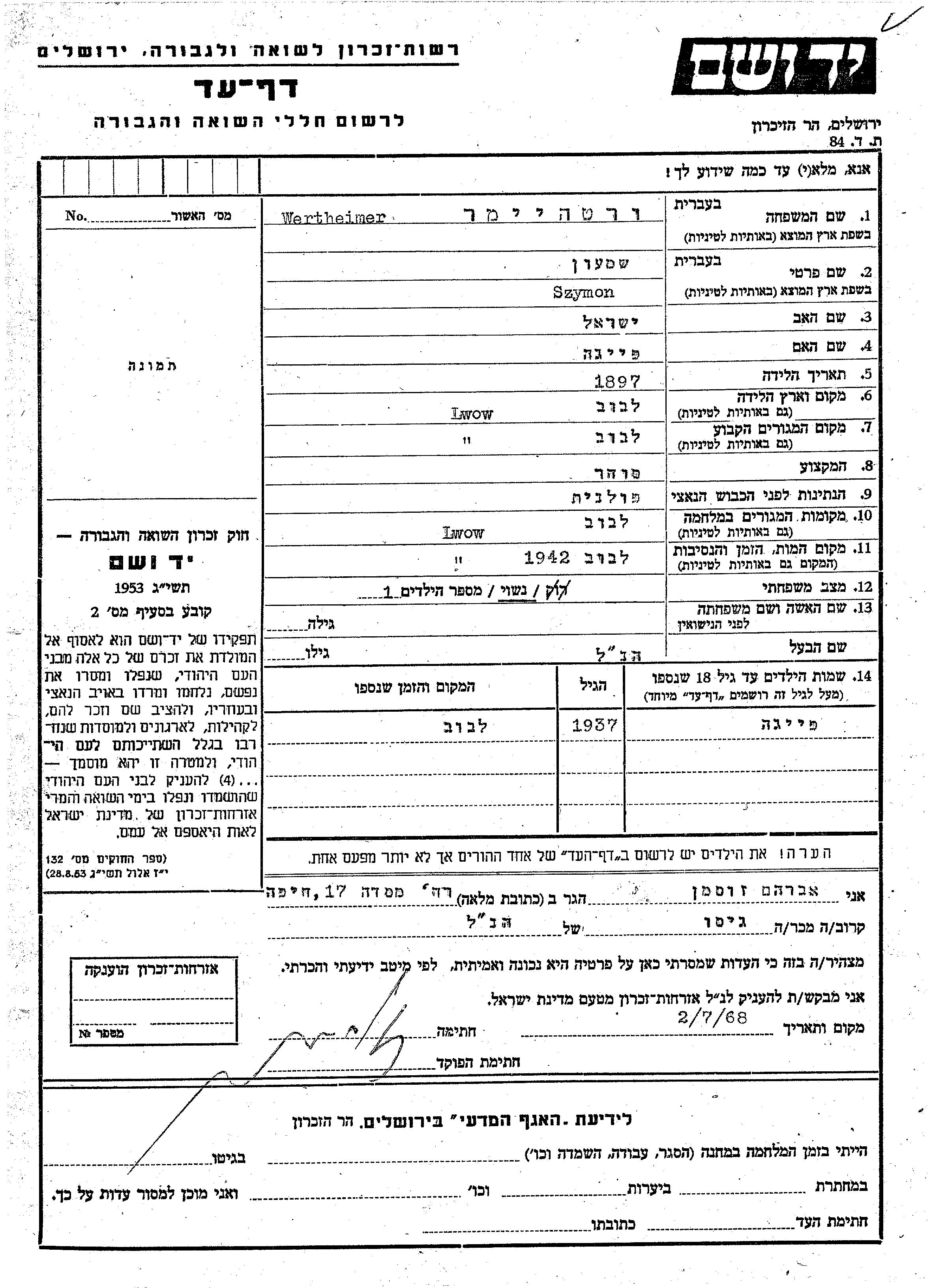 Wertheimer Szymon 1897 Lwow, Poland Page of Testimony