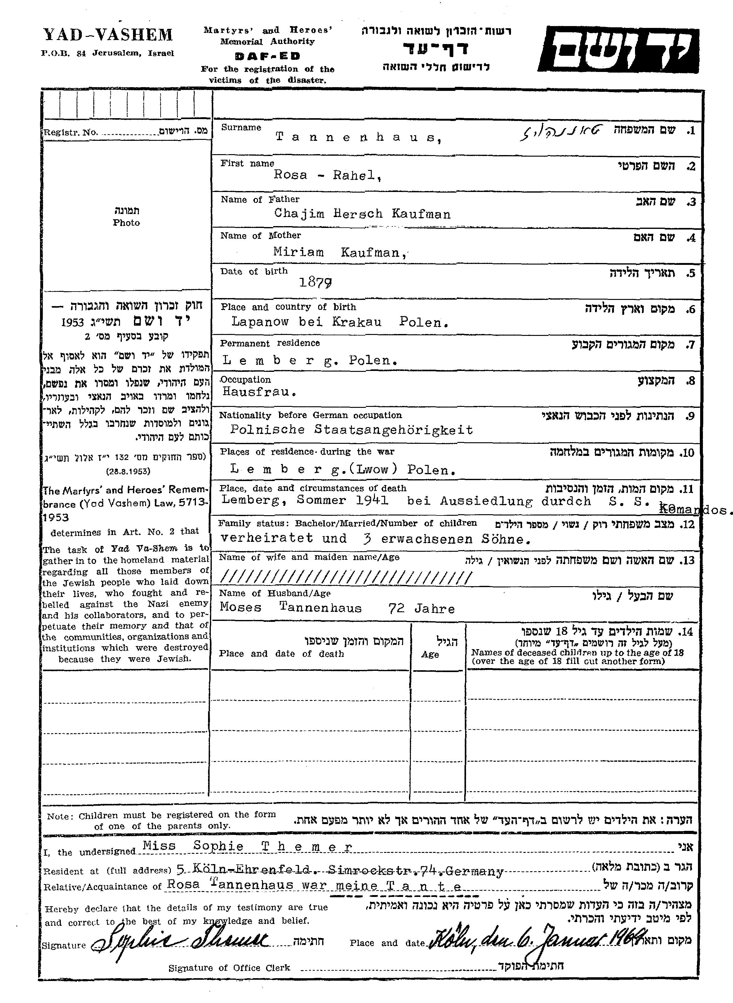 Rosa Rahel Tannenhaus nee Kaufman was born in Lapanow, Poland, 1879 to Chajim Hersch and Miriam. She was a housewife and married to Moses. Prior to WWII she lived in Lemberg, Poland. During the war she was in Lemberg, Poland. Rosa Rahel was murdered in the Shoah. Place of death: Lemberg, Poland, 07/1941.