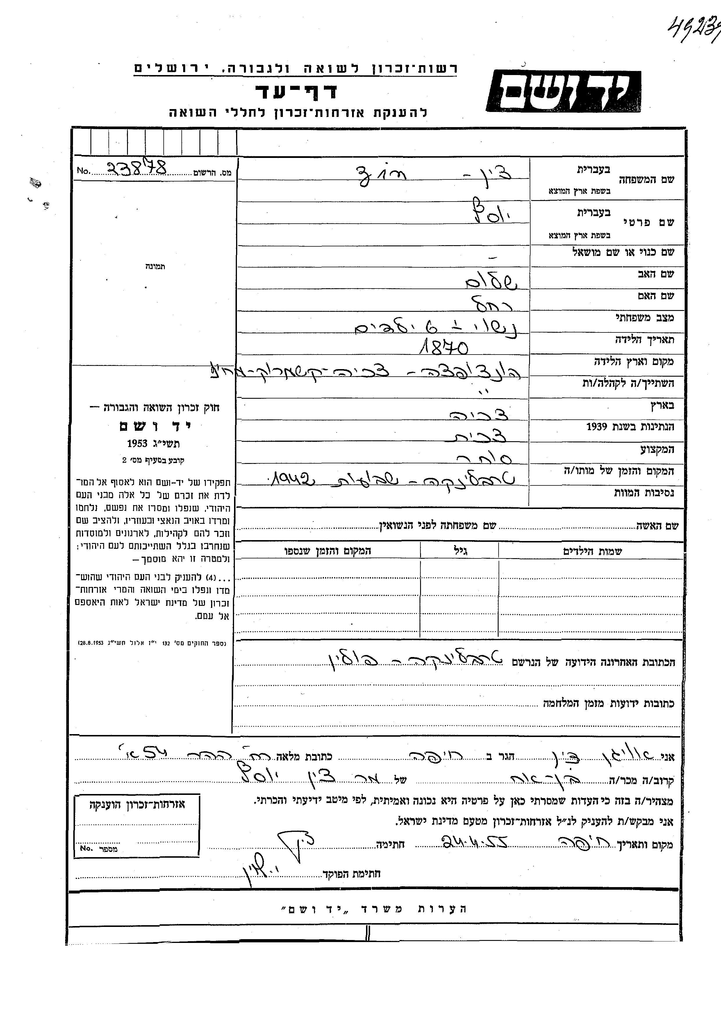 Yad Vashem - Pages of Testimony Names Memorial Collection