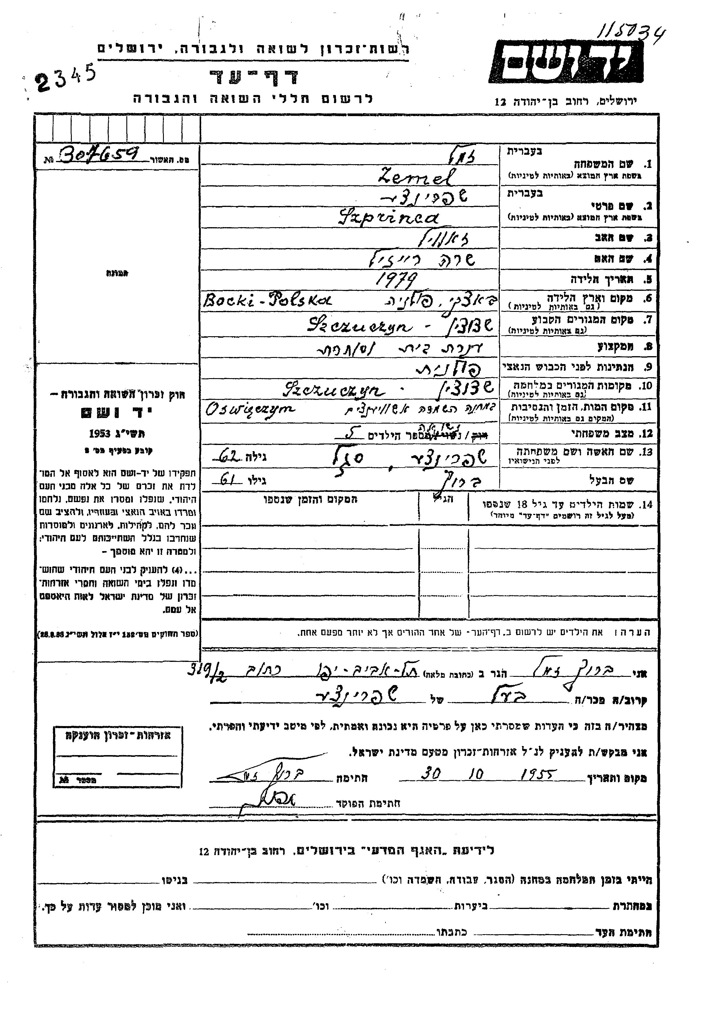 Szprinca Zemel nee Segal was born in Bocki, Poland, 1897 to Zavil and Sara Reizil. She was a merchant and married to Barukh. Prior to WWII she lived in Szczucin, Poland. During the war she was in Szczuczyn, Poland. Szprinca was murdered in the Shoah. Place of death: Auschwitz, Poland.