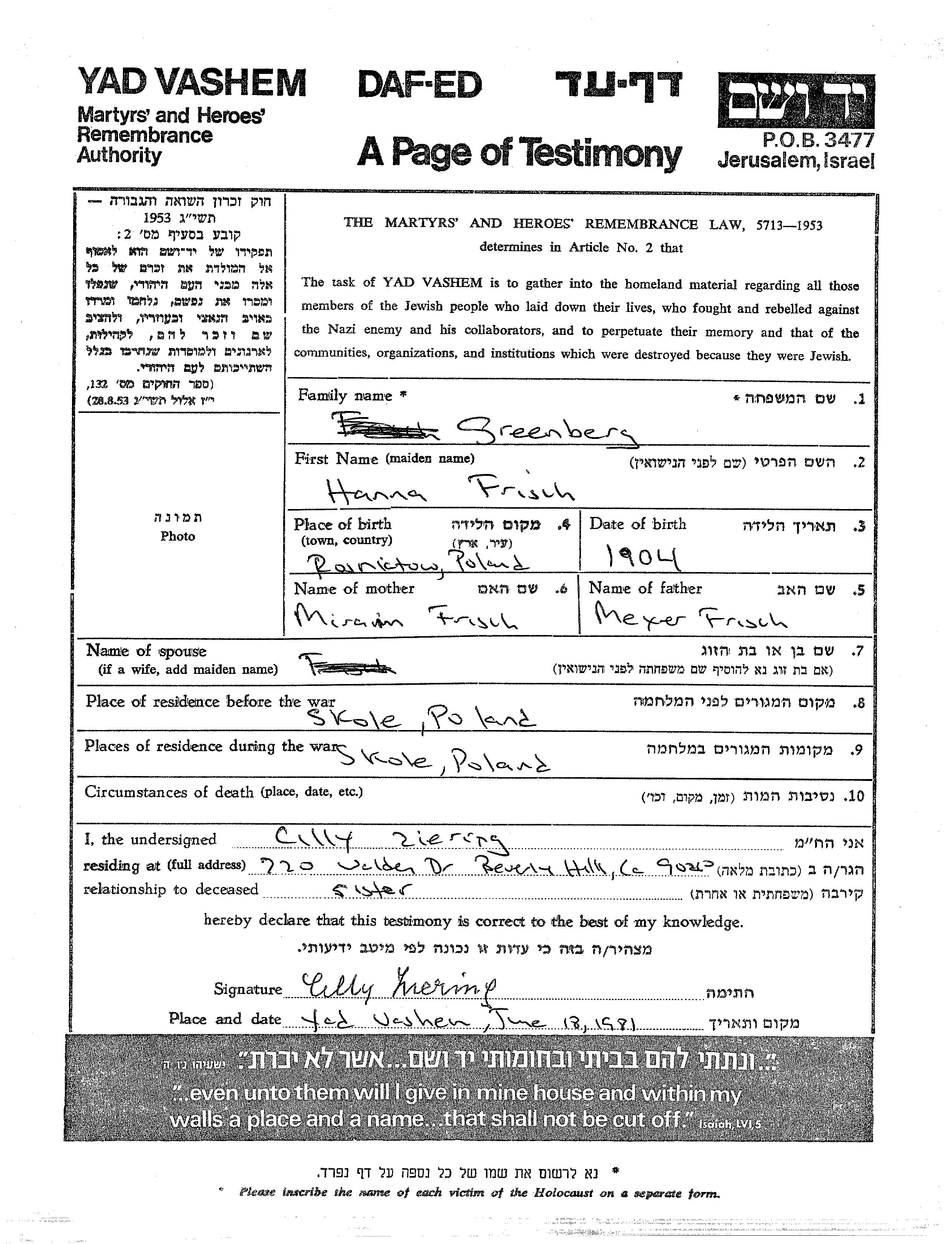 Hanna Greenberg nee Frisch was born in Raniszow, Poland, 1904 to Meyer and Miram. Prior to WWII she lived in Skole, Poland. During the war she was in Skole, Poland.