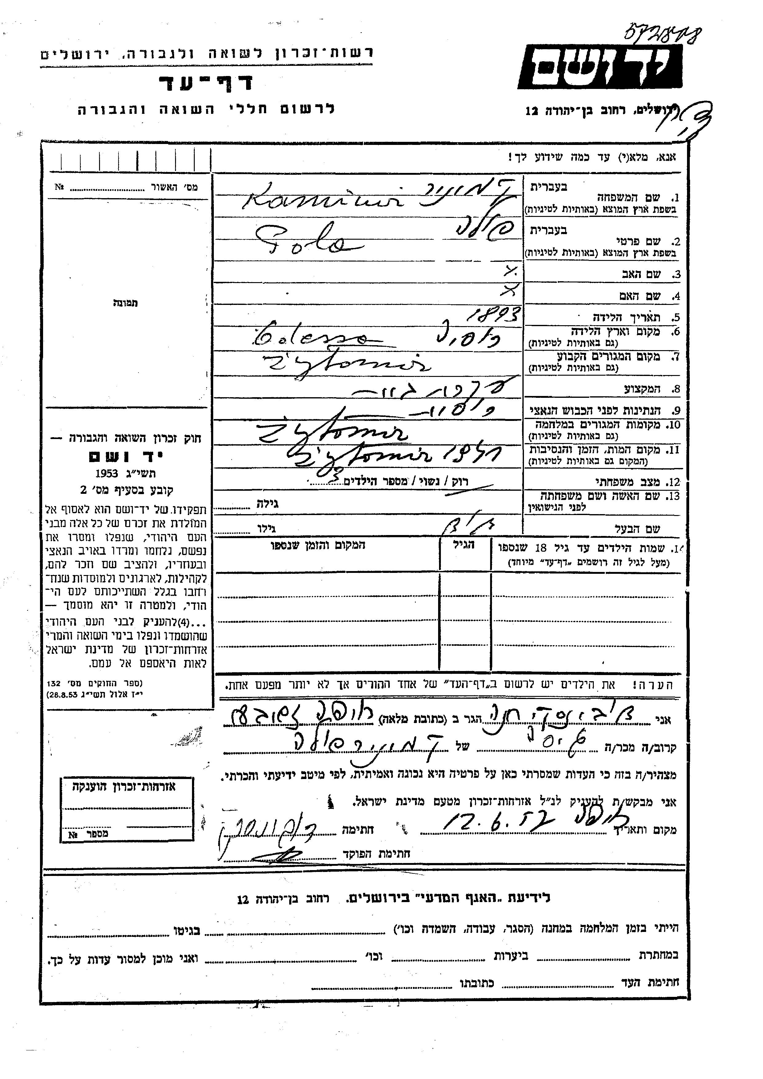 Kaminir Sola 1893 Zytomierz, Ukraine (USSR) Page of Testimony