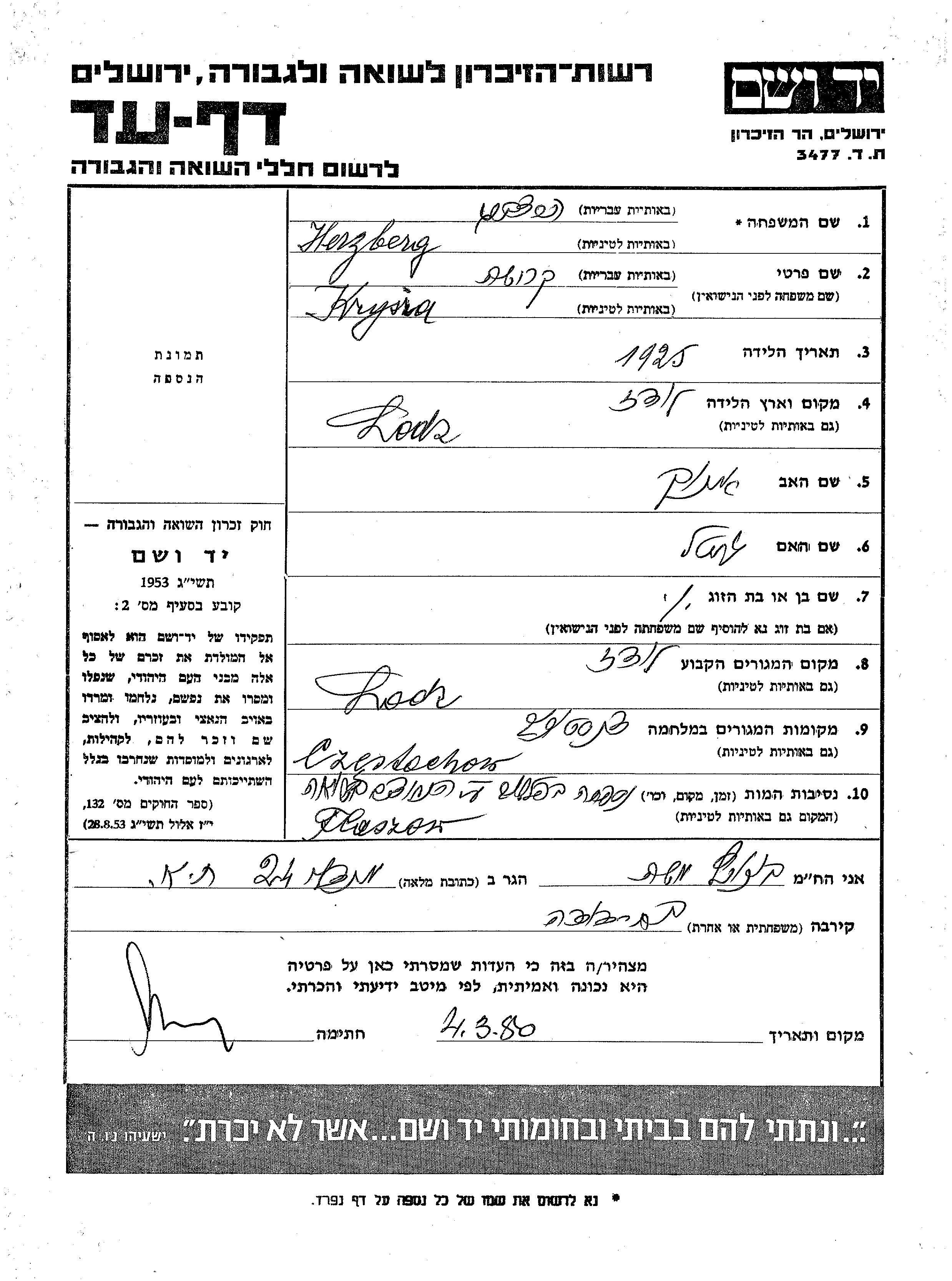 Krysia Herzberg was born in Lodzh, Poland, 1925 to Einokh and Gitel. Prior to WWII she lived in Lodz, Poland. During the war she was in Czestochow, Poland. Krysia was murdered in the Shoah. Place of death: Plaszow, Poland.
