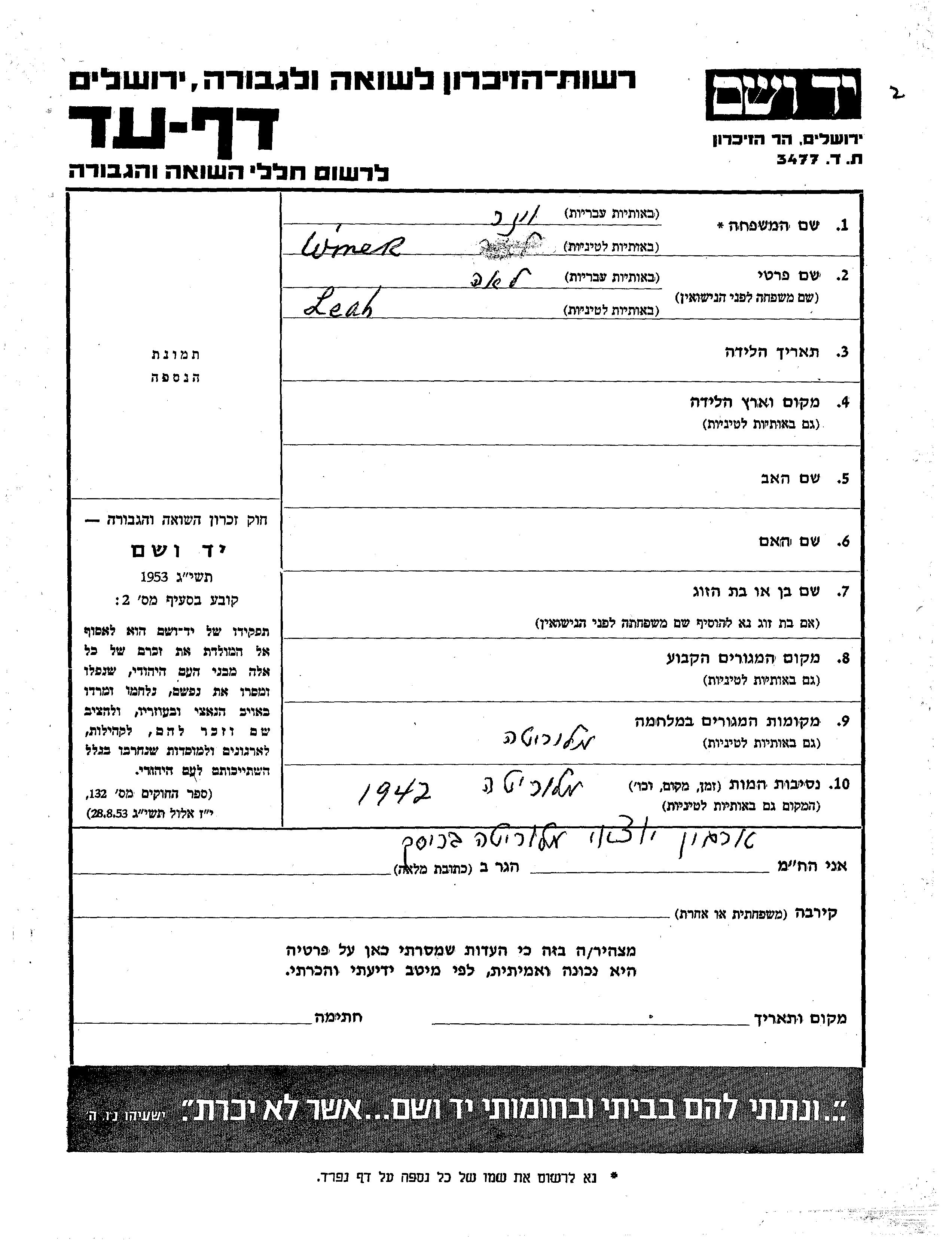 Winer Leah unstated place, Page of Testimony