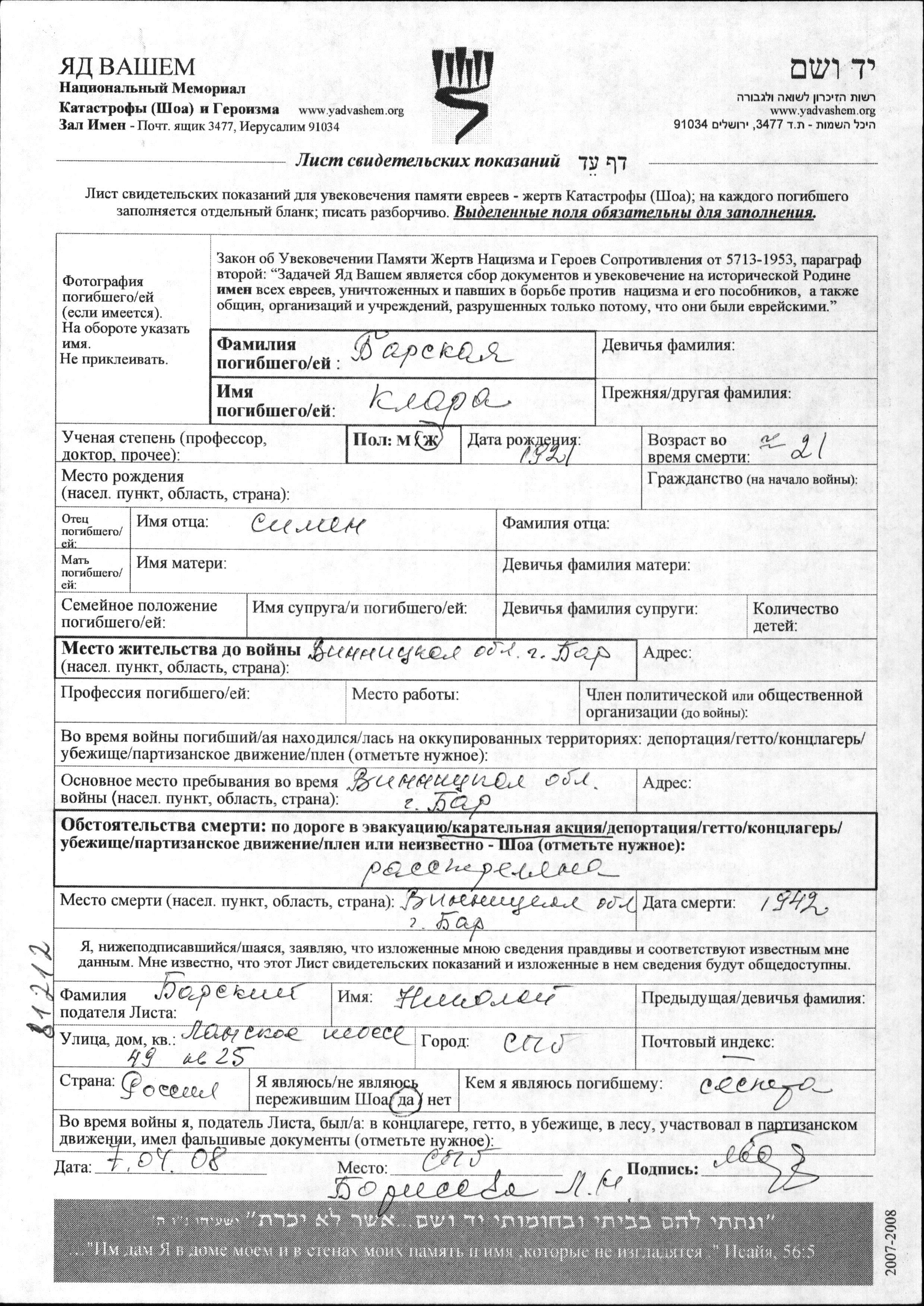 Klara Barskaya was born, 1921 to Simen. Prior to WWII she lived in Bar, Ukraine (USSR). During the war she was in Bar, Ukraine (USSR). Klara was murdered in the Shoah. Place of death: Bar, Ukraine (USSR), 1942.