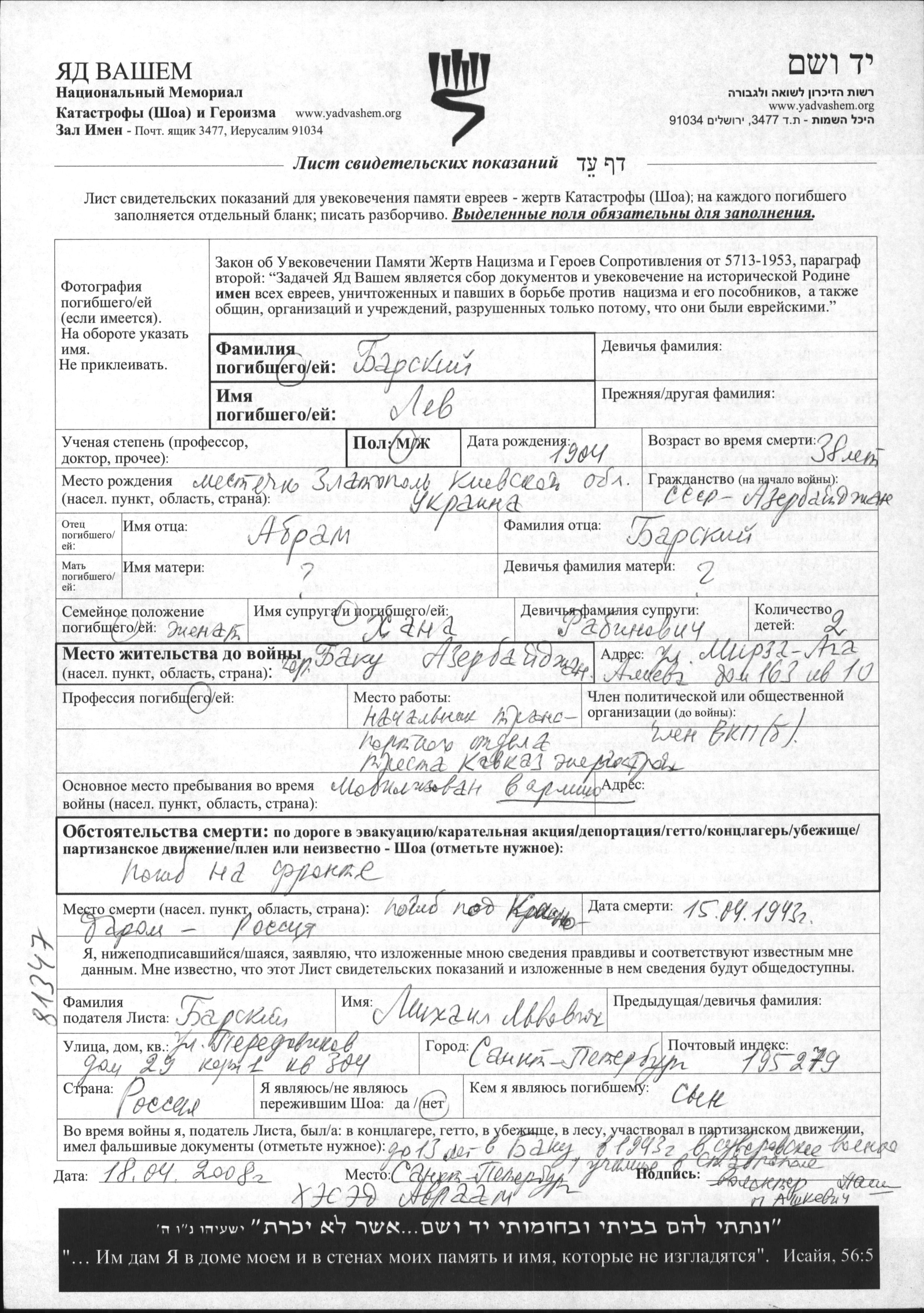 Lev Barski was born in Zlatopol, Ukraine (USSR), 1904 to Abram. He was an abteilungsleiterin german and married to Khana nee Rabinovich. Prior to WWII he lived in Baku, Azerbaijan (USSR). During the war he was in the Soviet armed forces. Lev was killed in military service in WWII. Place of death: Krasnodar, Russia (USSR), 15/04/1943.