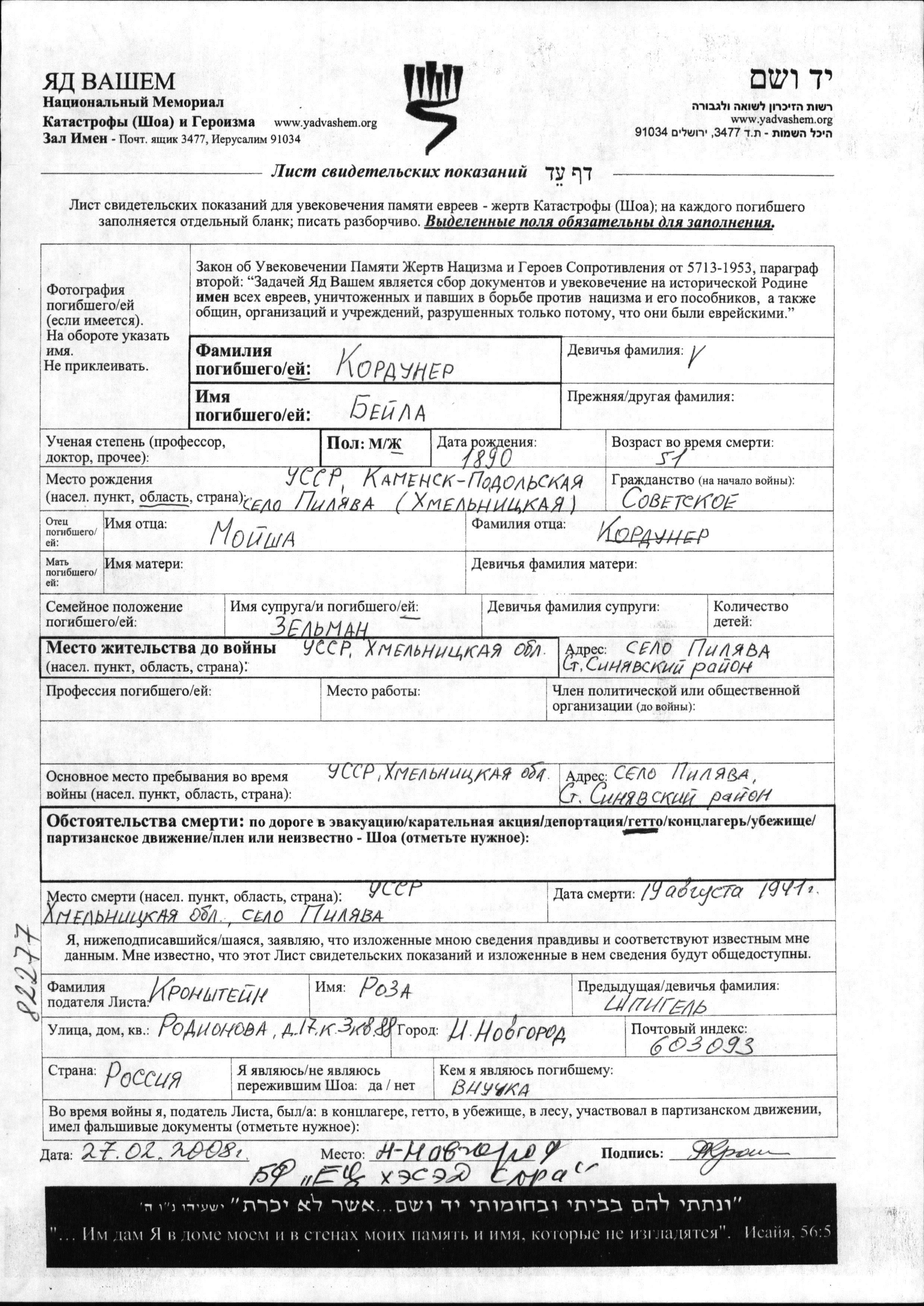 Korduner Beyla 1890 Pilyava, Ukraine (USSR) Page of Testimony