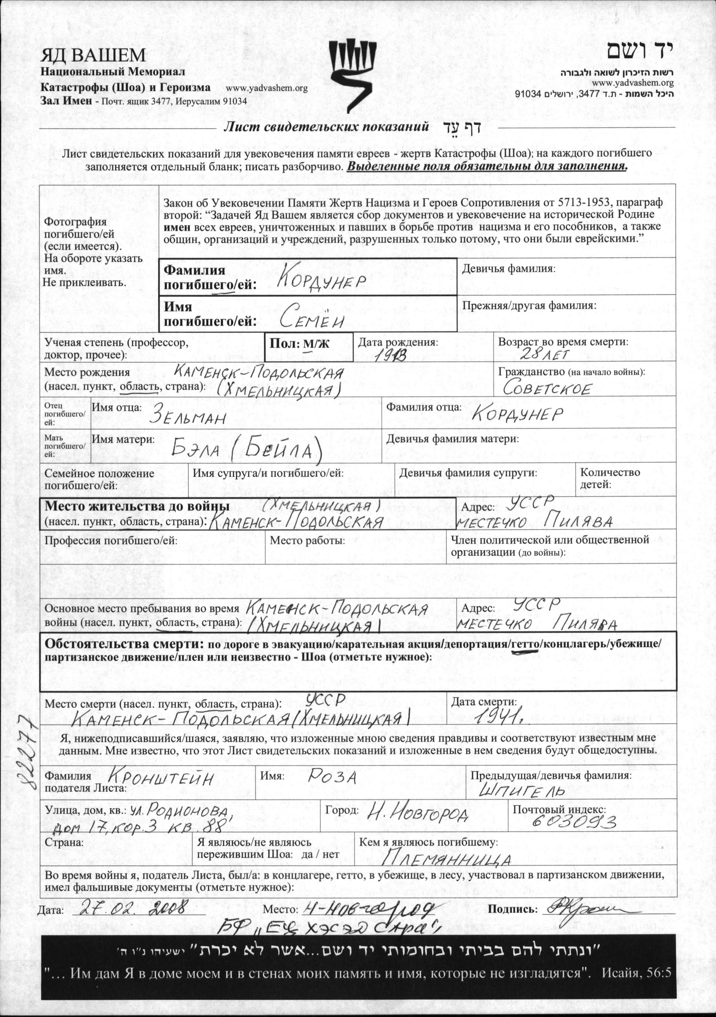 Korduner Semen 1913 Pilyava, Ukraine (USSR) Page of Testimony