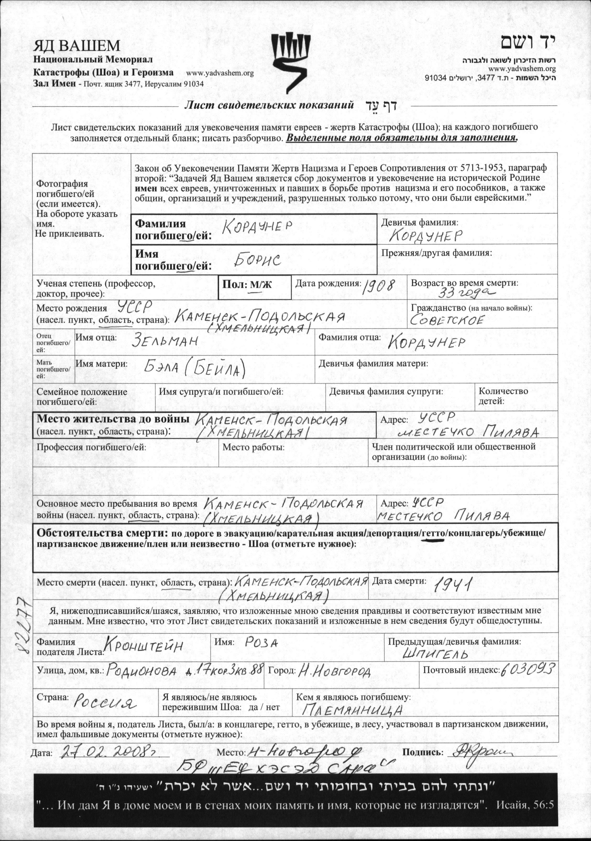Korduner Boris 1908 Pilyava, Ukraine (USSR) Page of Testimony
