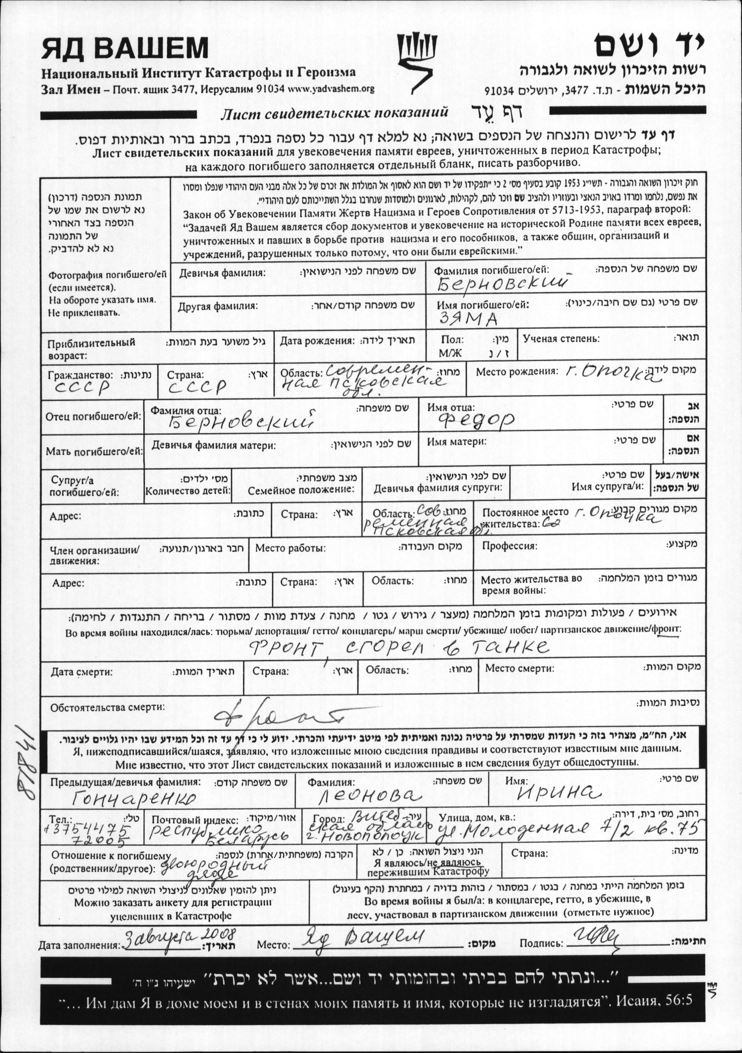 Zyama Bernovski was born in Opochka, Russia (USSR) to Fyodor. Prior to WWII he lived in Opochka, Russia (USSR). During the war he was in the Soviet armed forces. Zyama was killed in military service in WWII.