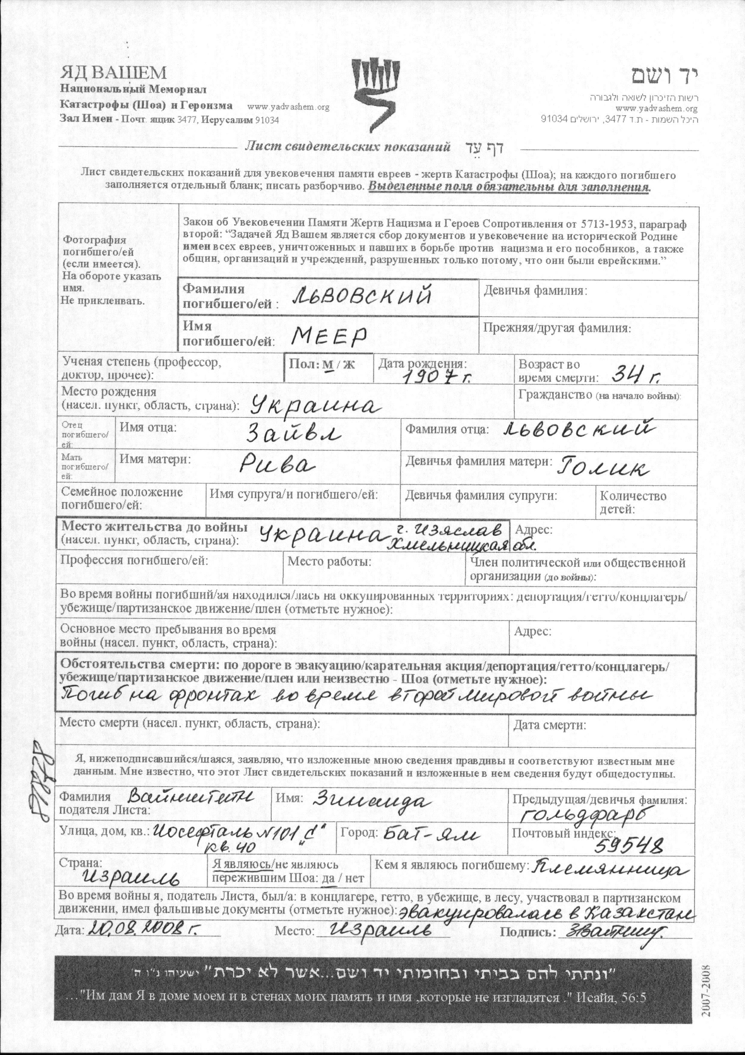 Meyer Lvovski was born in Ukraine (USSR), 1907 to Zaivl and Riva nee Golik. Prior to WWII he lived in Izyaslav, Ukraine (USSR). During the war he was in the Soviet armed forces. Meyer was killed in military service in WWII.