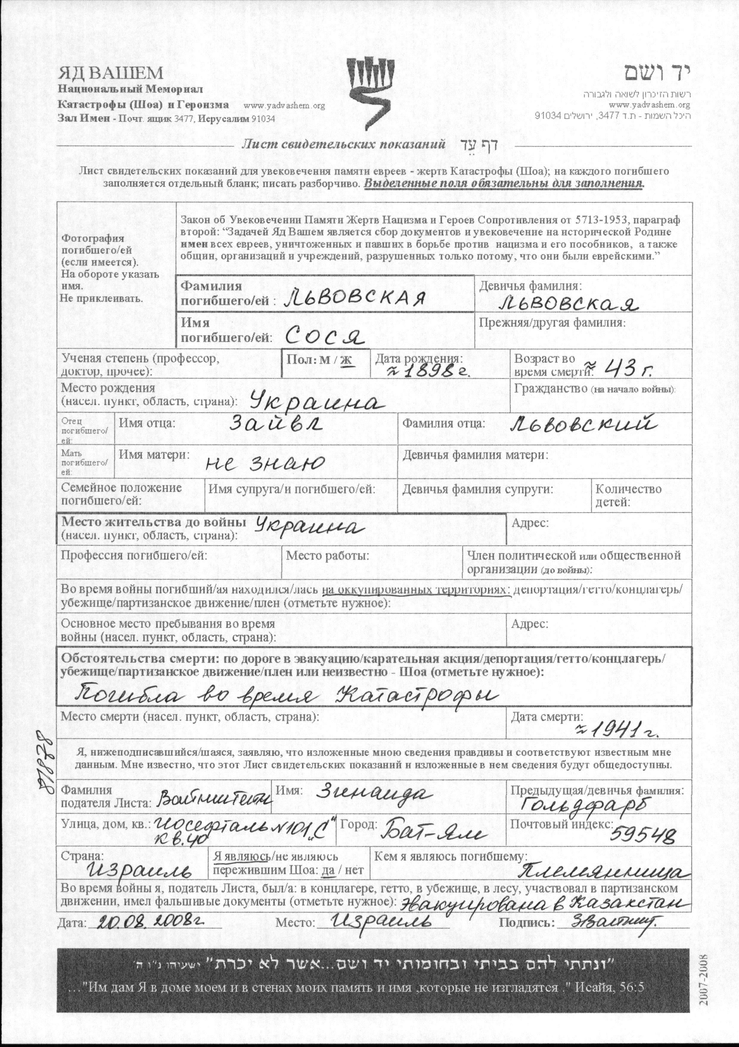 Sosya Lvovskaya was born, 1898 to Zaivl. Prior to WWII she lived in Ukraine (USSR). During the war she was in Ukraine (USSR). Sosya was murdered in the Shoah. Place of death: Ukraine (USSR), 1941.