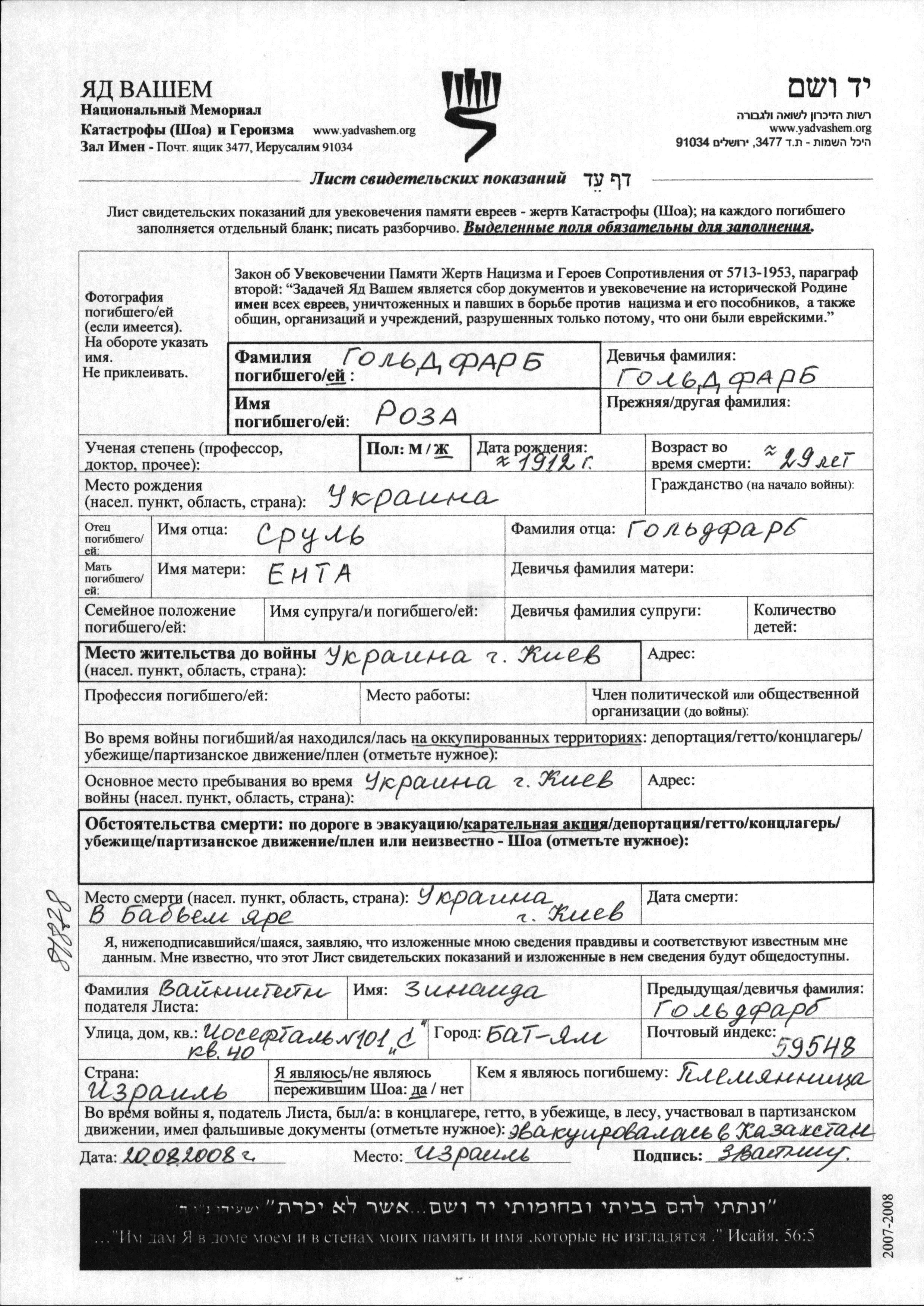 Roza Goldfarb was born in Ukraine (USSR), 1912 to Srul and Yenta. Prior to WWII she lived in Kiev, Ukraine (USSR). During the war she was in Kiev, Ukraine (USSR). Roza was murdered in the Shoah. Place of death: Babi Yar, Ukraine (USSR).