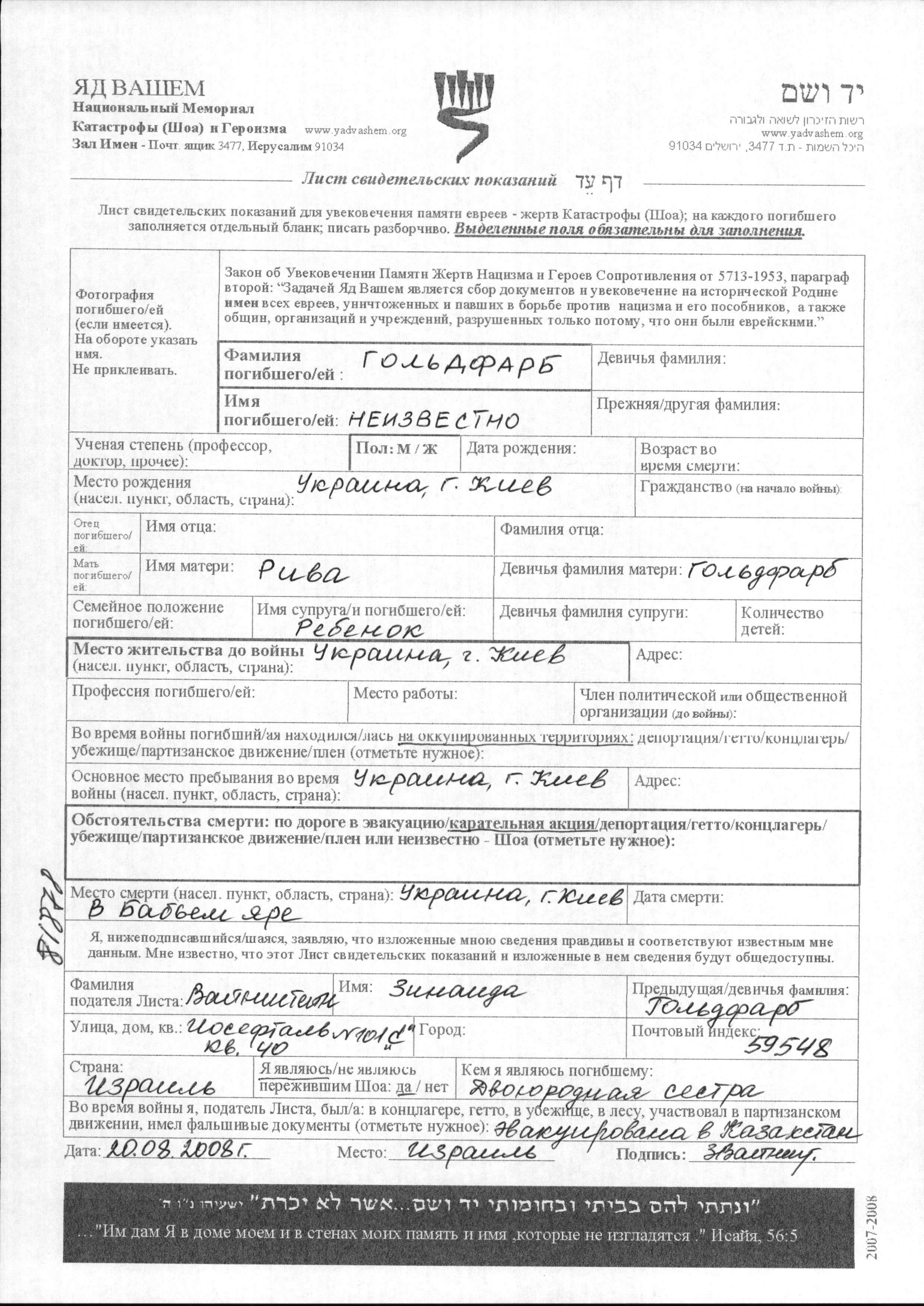 First name unknown Goldfarb was born in Kiev, Ukraine (USSR) to Riva nee Goldfarb. Was child. Prior to WWII lived in Kiev, Ukraine (USSR). During the war was in Kiev, Ukraine (USSR). Was murdered in the Shoah. Place of death: Babi Yar, Ukraine (USSR).