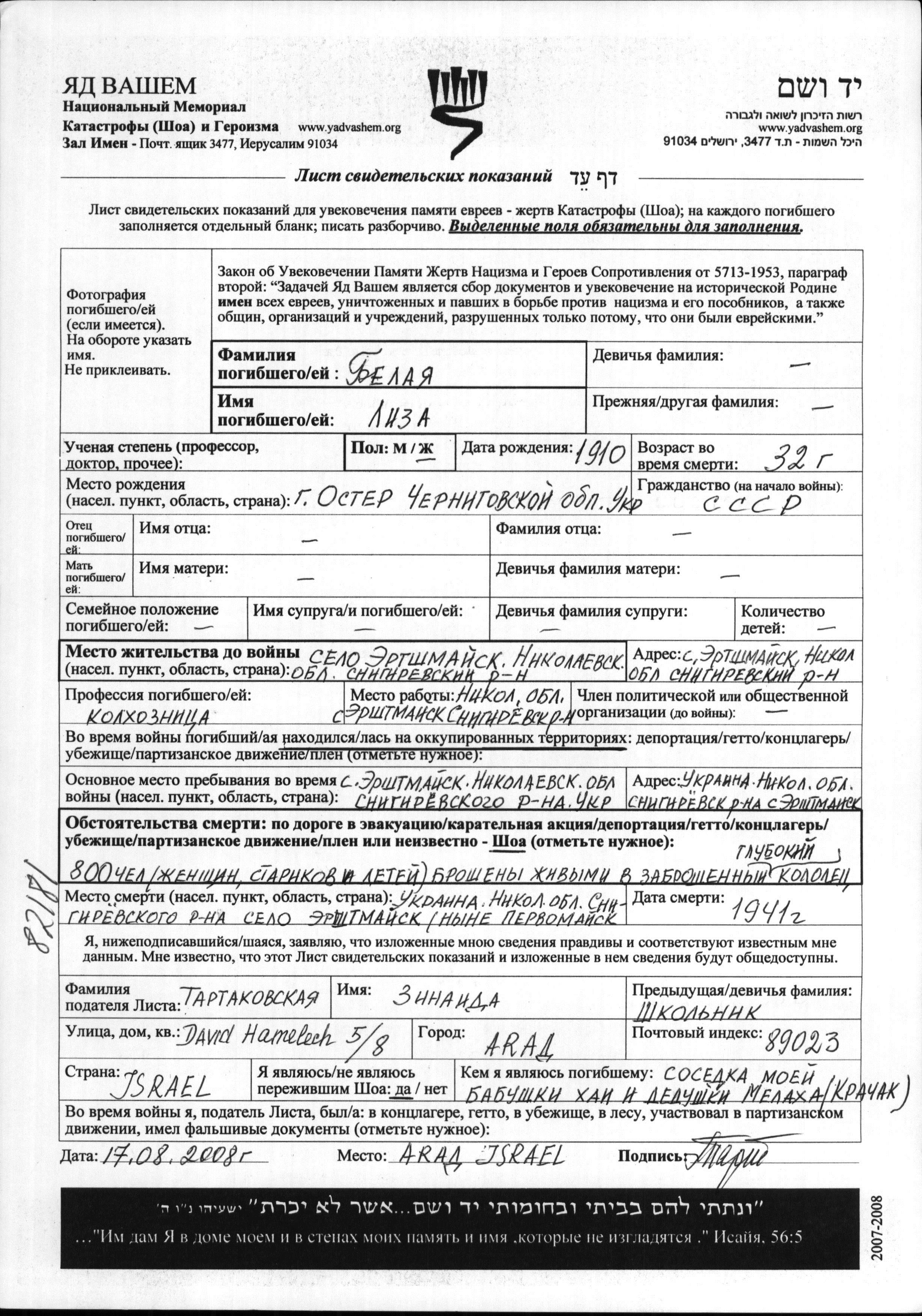 Liza Belaya was born in Oster, Ukraine (USSR), 1910. She was a kolkhoznik / kolkhoznitza. Prior to WWII she lived in Ershtmaysk, Ukraine (USSR). During the war she was in Ershtmaysk, Ukraine (USSR). Liza was murdered in the Shoah. Place of death: Ershtmaysk, Ukraine (USSR), 1941.