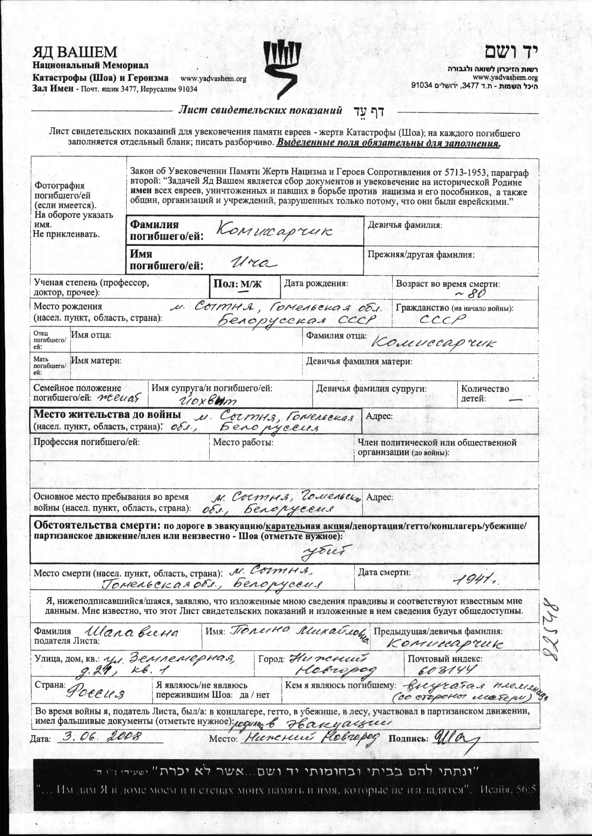 Icha Komissarchik was born in Sitnya, Belorussia (USSR). He was married to Yokhvit. Prior to WWII he lived in Sitnya, Belorussia (USSR). During the war he was in Sitnya, Belorussia (USSR). Icha was murdered in the Shoah. Place of death: Sitnya, Belorussia (USSR), 1941.