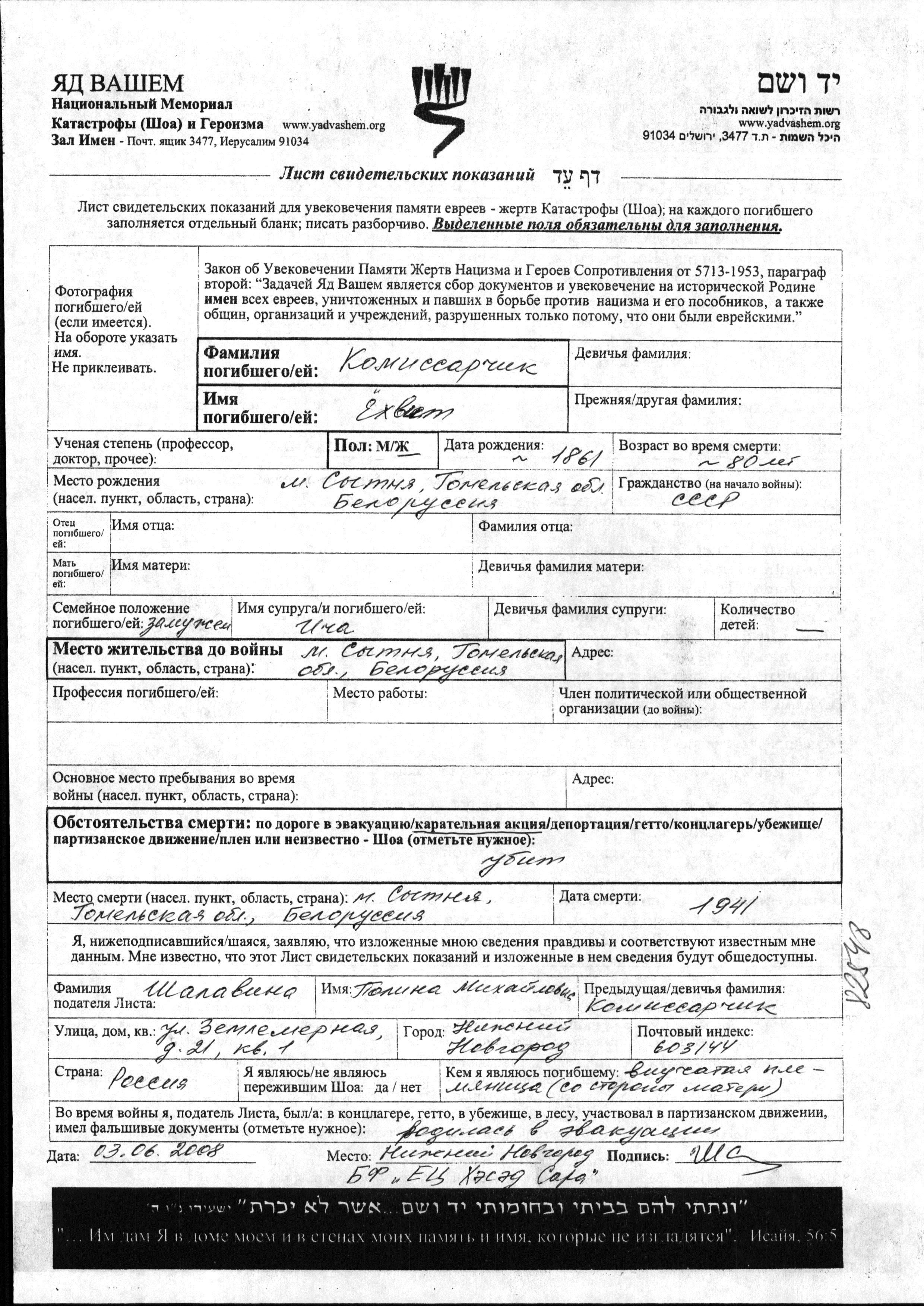 Yokhvit Komissarchik was born in Sitnya, Belorussia (USSR), 1861. She was married to Icha. Prior to WWII she lived in Sitnya, Belorussia (USSR). During the war she was in Sitnya, Belorussia (USSR). Yokhvit was murdered in the Shoah. Place of death: Sitnya, Belorussia (USSR), 1941.