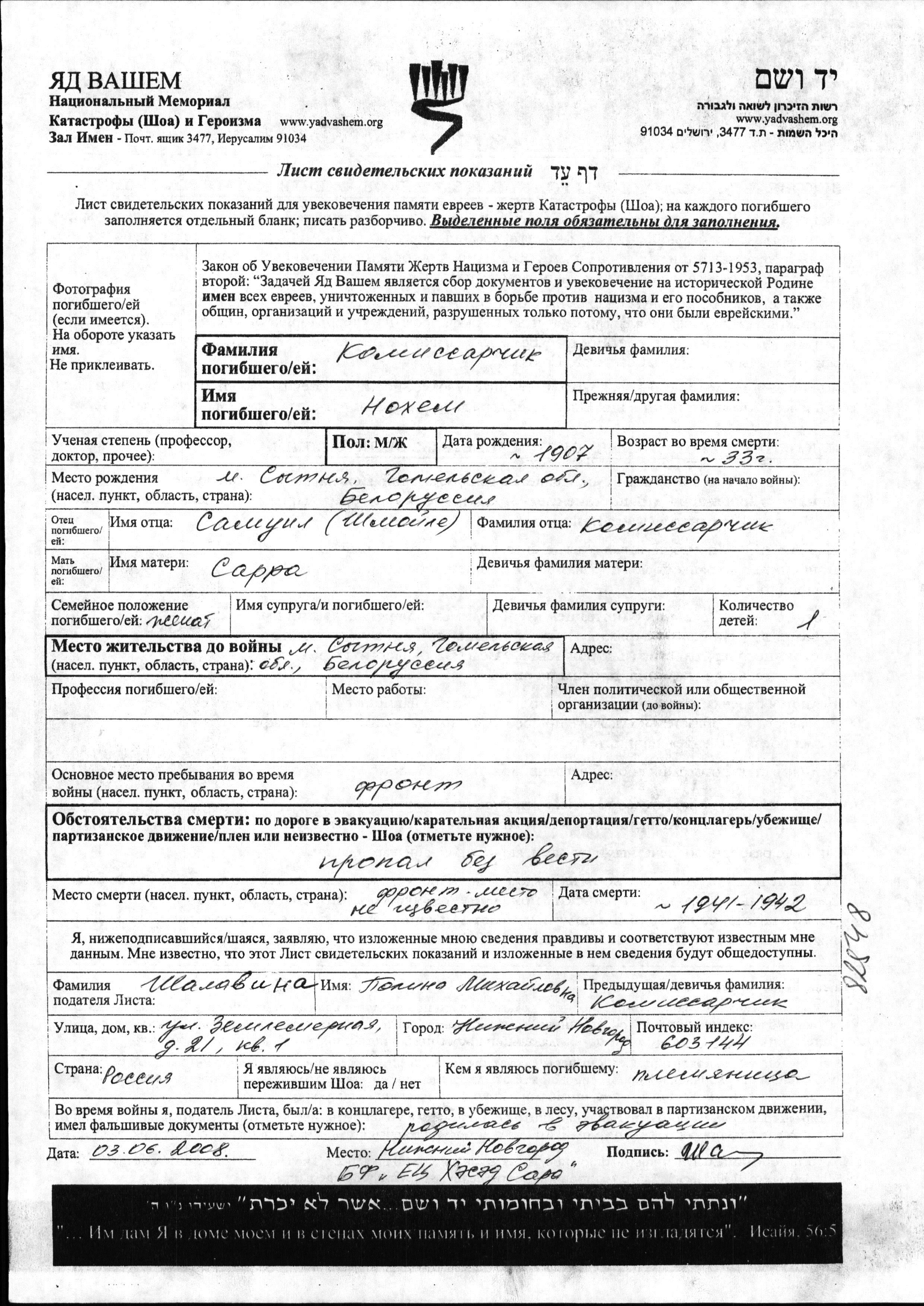 Nokhem Komissarchik was born in Sitnya, Belorussia (USSR), 1907 to Samuil and Sarra. He was married. Prior to WWII he lived in Sitnya, Belorussia (USSR). During the war he was in the Soviet armed forces. Nokhem was murdered in the Shoah. Place of death: unknown, 1941.