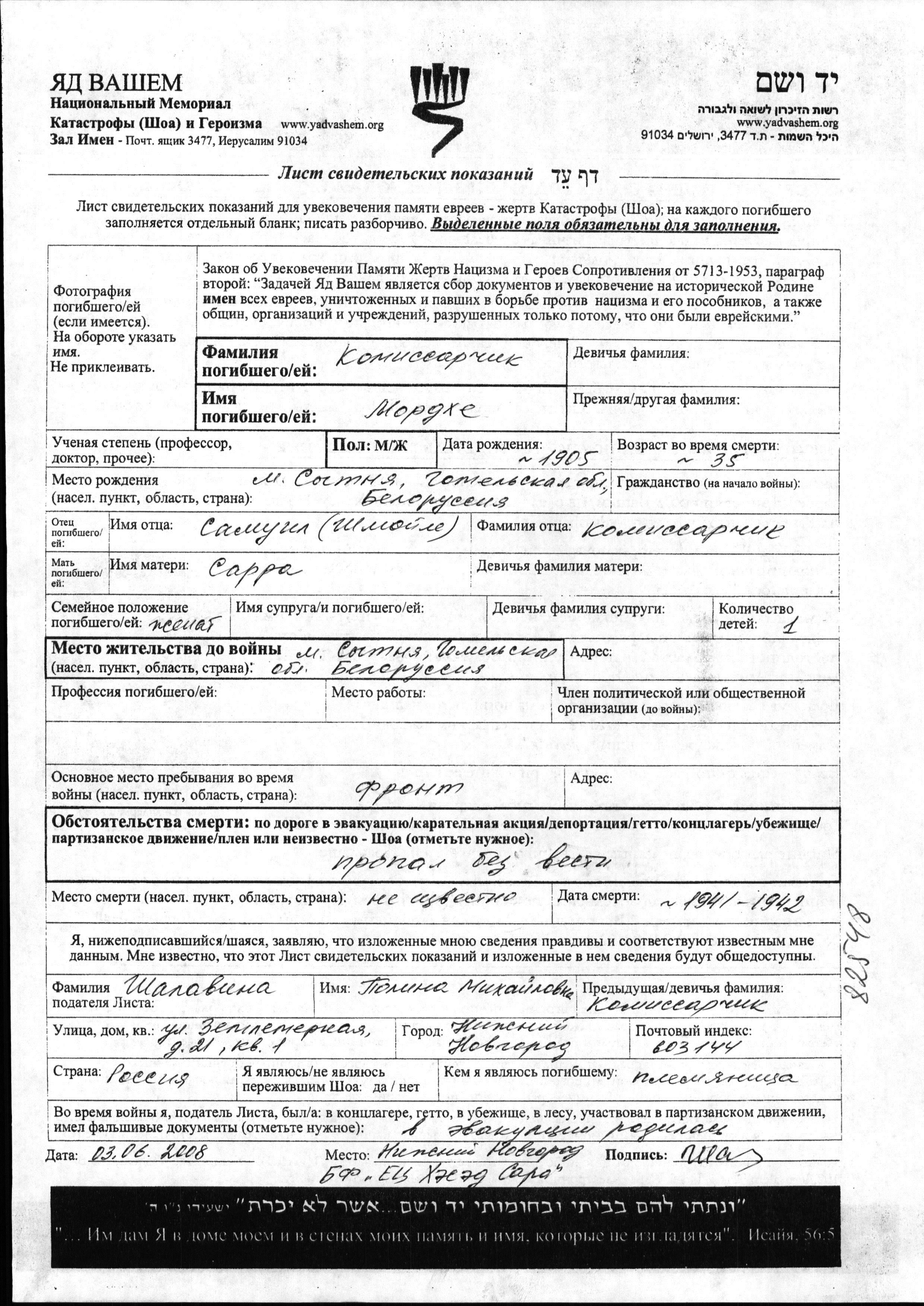 Mordkhe Komissarchik was born in Sitnya, Belorussia (USSR), 1905 to Samuil and Sarra. He was married. Prior to WWII he lived in Sitnya, Belorussia (USSR). During the war he was in the Soviet armed forces. Mordkhe was murdered in the Shoah. Place of death: unknown, 1941.