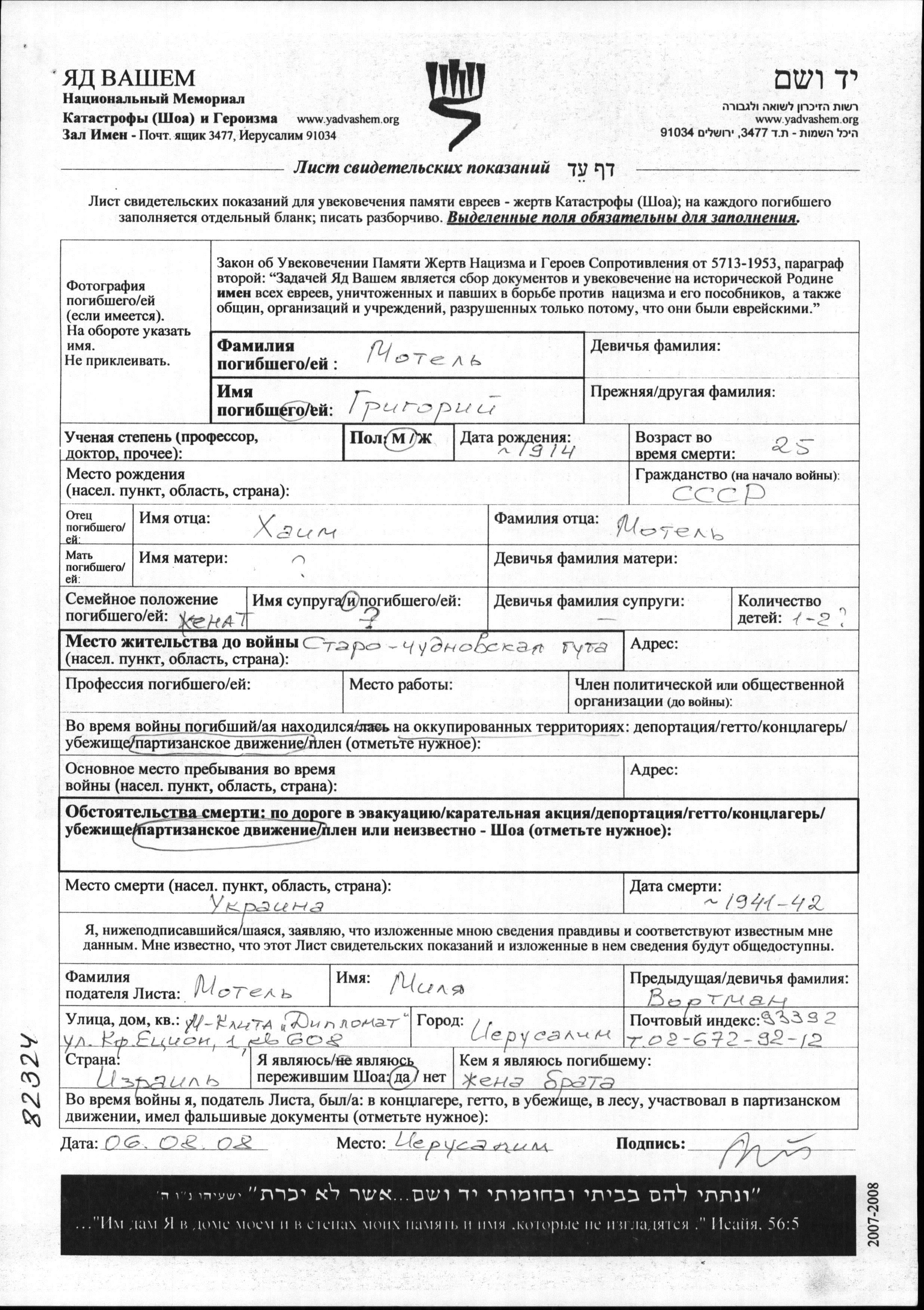 Grigori Motel was born, 1914 to Khaim. He was married. Prior to WWII he lived in Starochudnovskaya Guta, Ukraine (USSR). During the war he was in Ukraine (USSR). Grigori was murdered in the Shoah. Place of death: Ukraine (USSR), 1941.