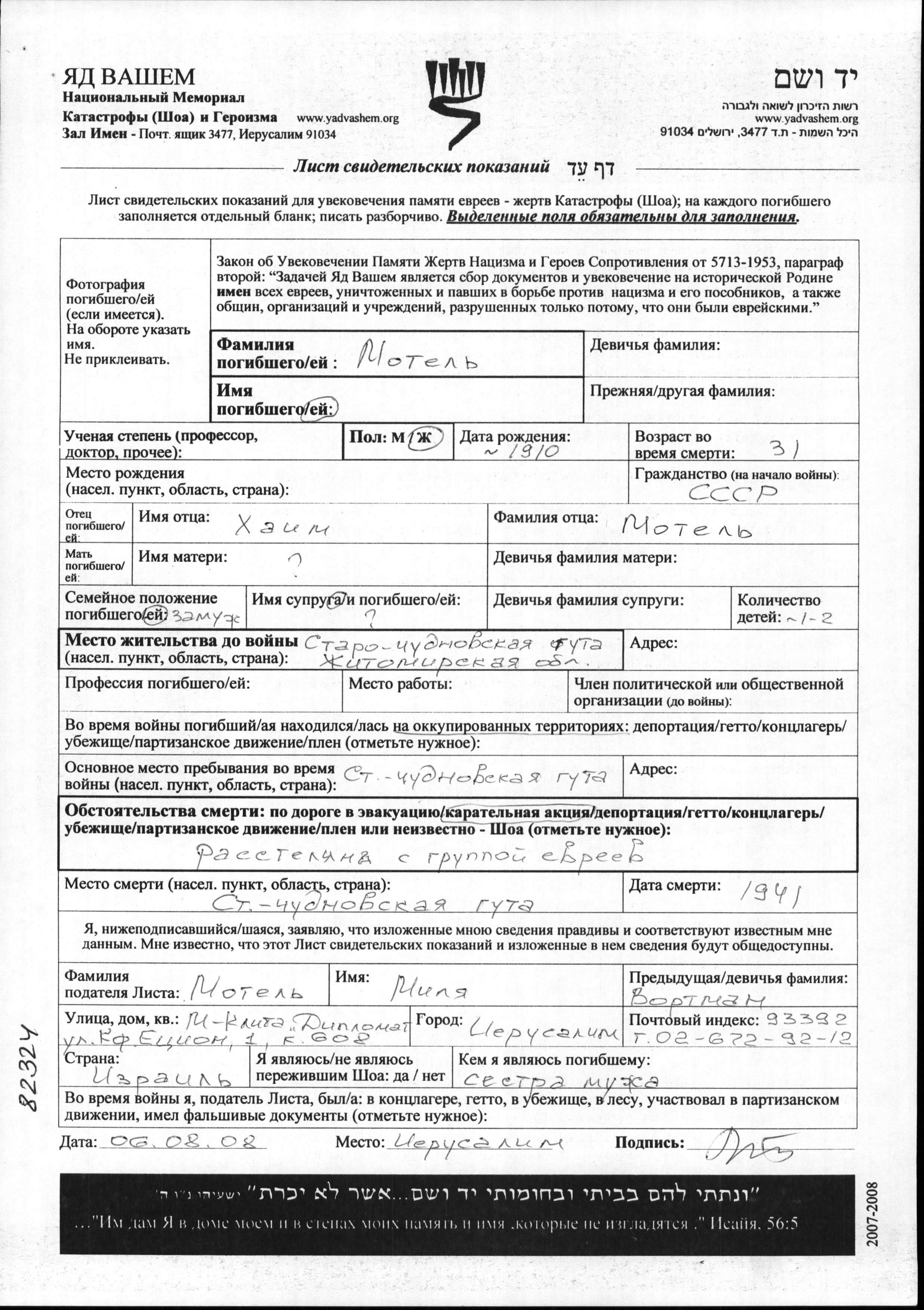 First name unknown Motel was born, 1910 to Khaim. She was married. Prior to WWII she lived in Starochudnovskaya Guta, Ukraine (USSR). During the war she was in Starochudnovskaya Guta, Ukraine (USSR). She was murdered in the Shoah. Place of death: Starochudnovskaya Guta, Ukraine (USSR), 1941.