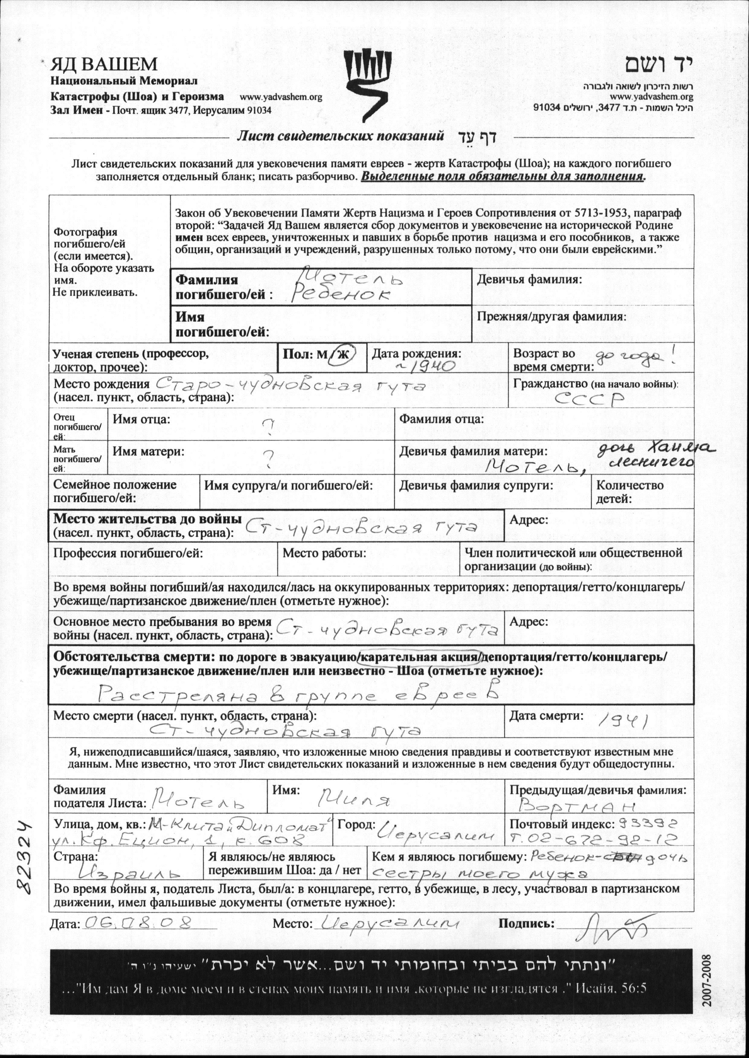 First name unknown Motel was born in Starochudnovskaya Guta, Ukraine (USSR), 1940. She was baby. Prior to WWII she lived in Starochudnovskaya Guta, Ukraine (USSR). During the war she was in Starochudnovskaya Guta, Ukraine (USSR). She was murdered in the Shoah. Place of death: Starochudnovskaya Guta, Ukraine (USSR), 1941.