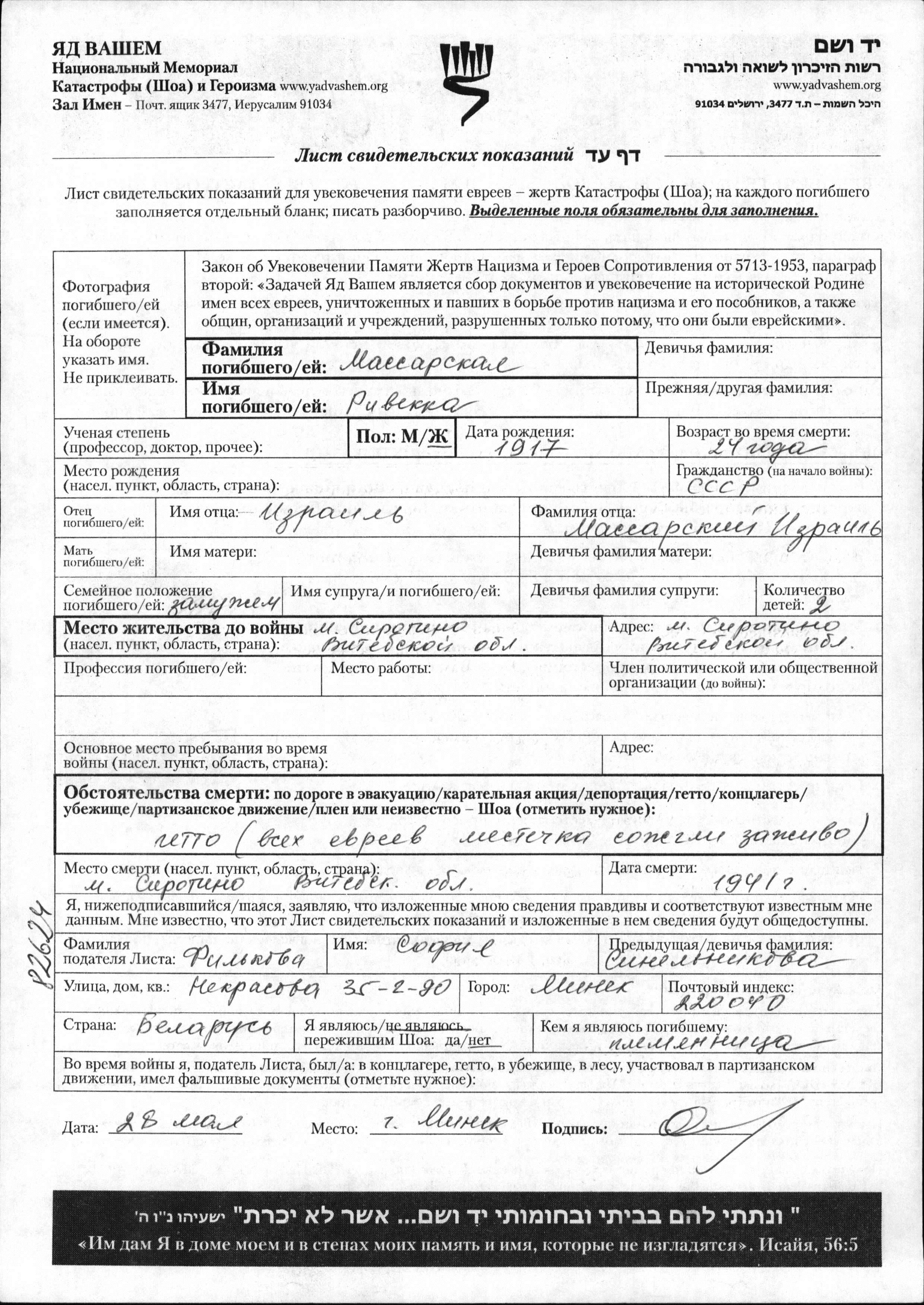 Massarskaya Rivekka 1917 Sirotino, Belorussia (USSR) Page of Testimony