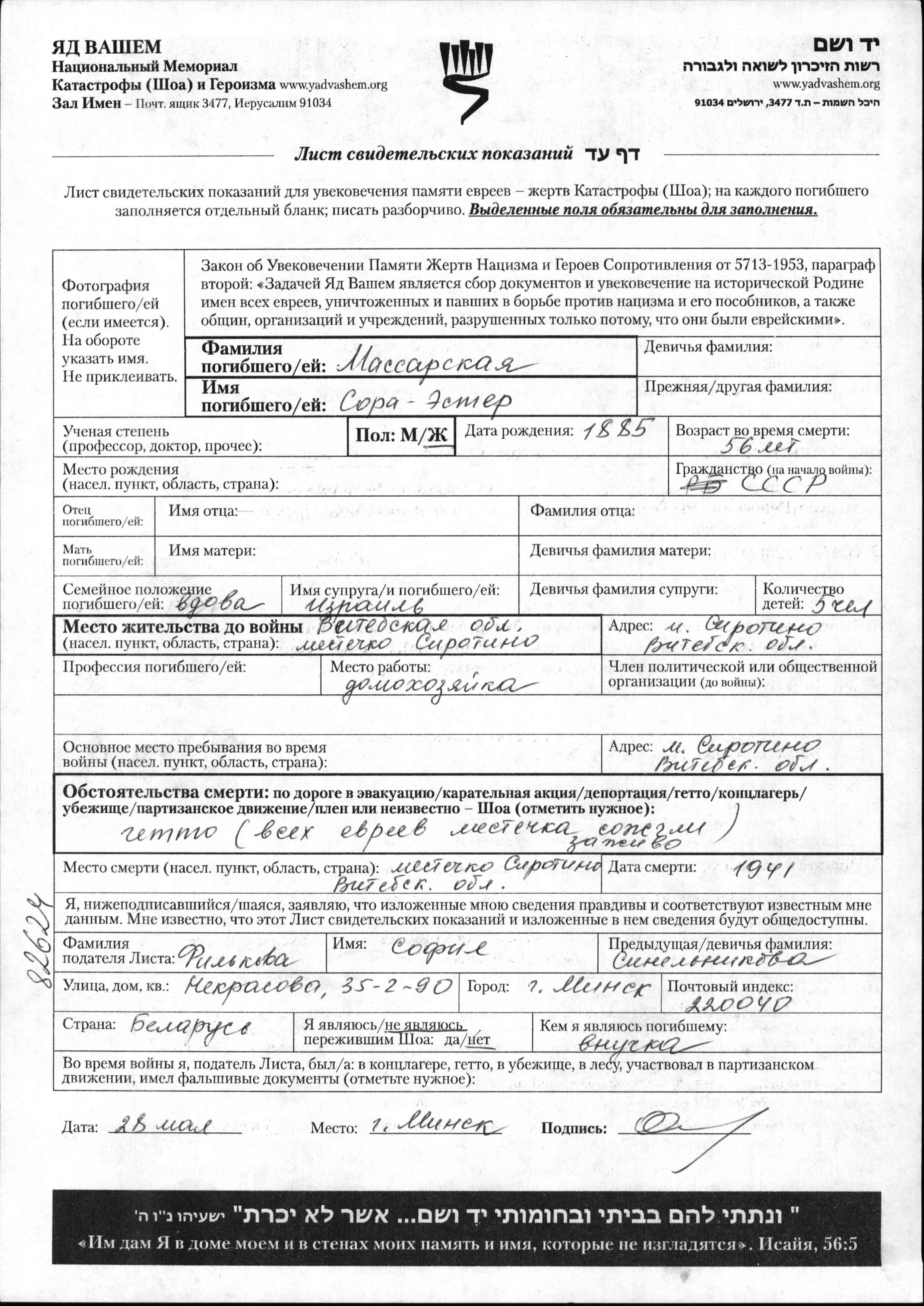 Sora Ester Massarskaya was born, 1885. She was a housewife and a widow of Izrail. Prior to WWII she lived in Sirotino, Belorussia (USSR). During the war she was in Sirotino, Belorussia (USSR). Sora Ester was murdered in the Shoah. Place of death: Sirotino, Belorussia (USSR), 1941.
