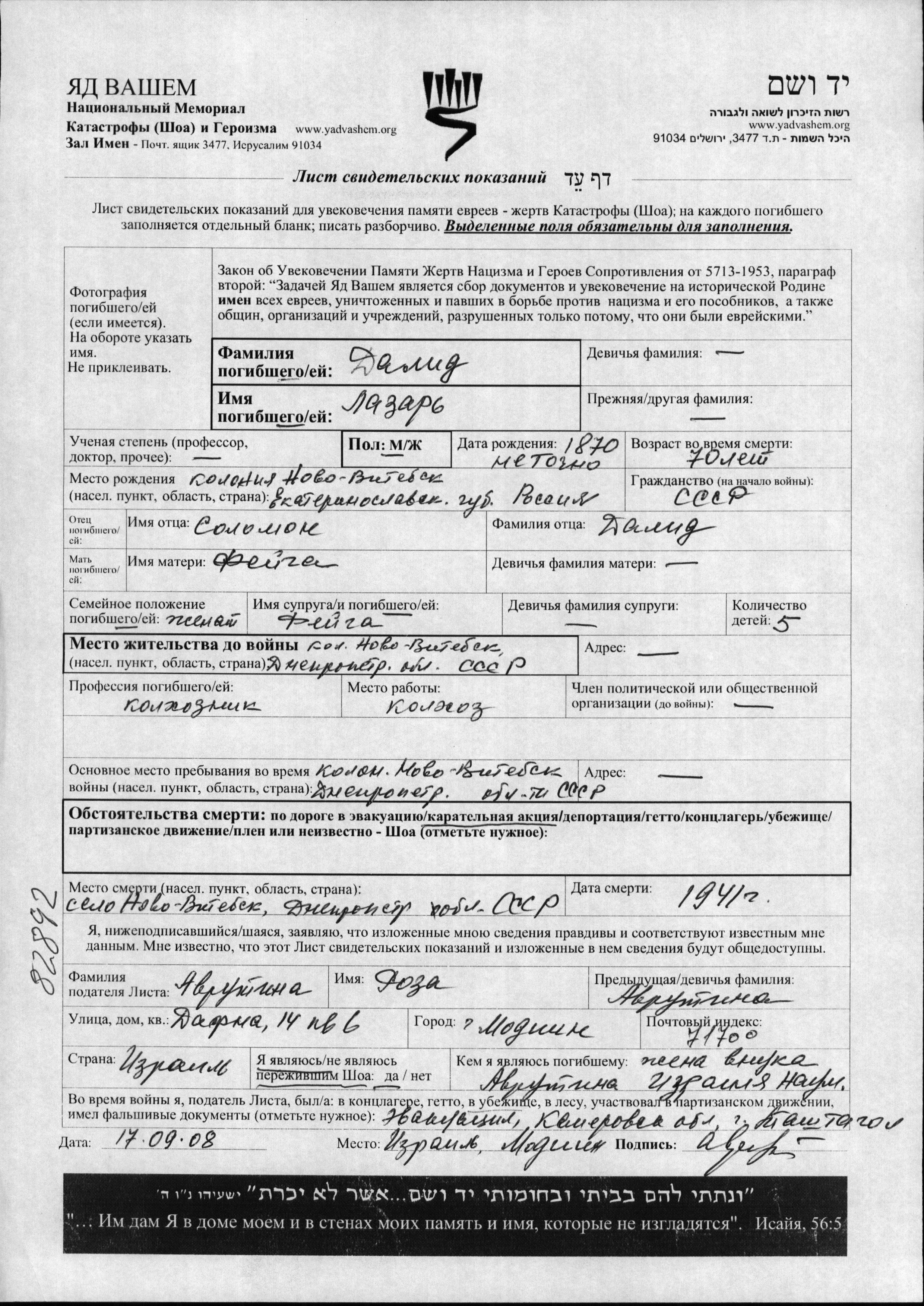 Lazar Dalid was born in Novo Vitebsk, Ukraine (USSR), 1870 to Solomon and Feiga. He was a kolkhoznik / kolkhoznitza and married to Feiga. Prior to WWII he lived in Novo Vitebsk, Ukraine (USSR). During the war he was in Novo Vitebsk, Ukraine (USSR).