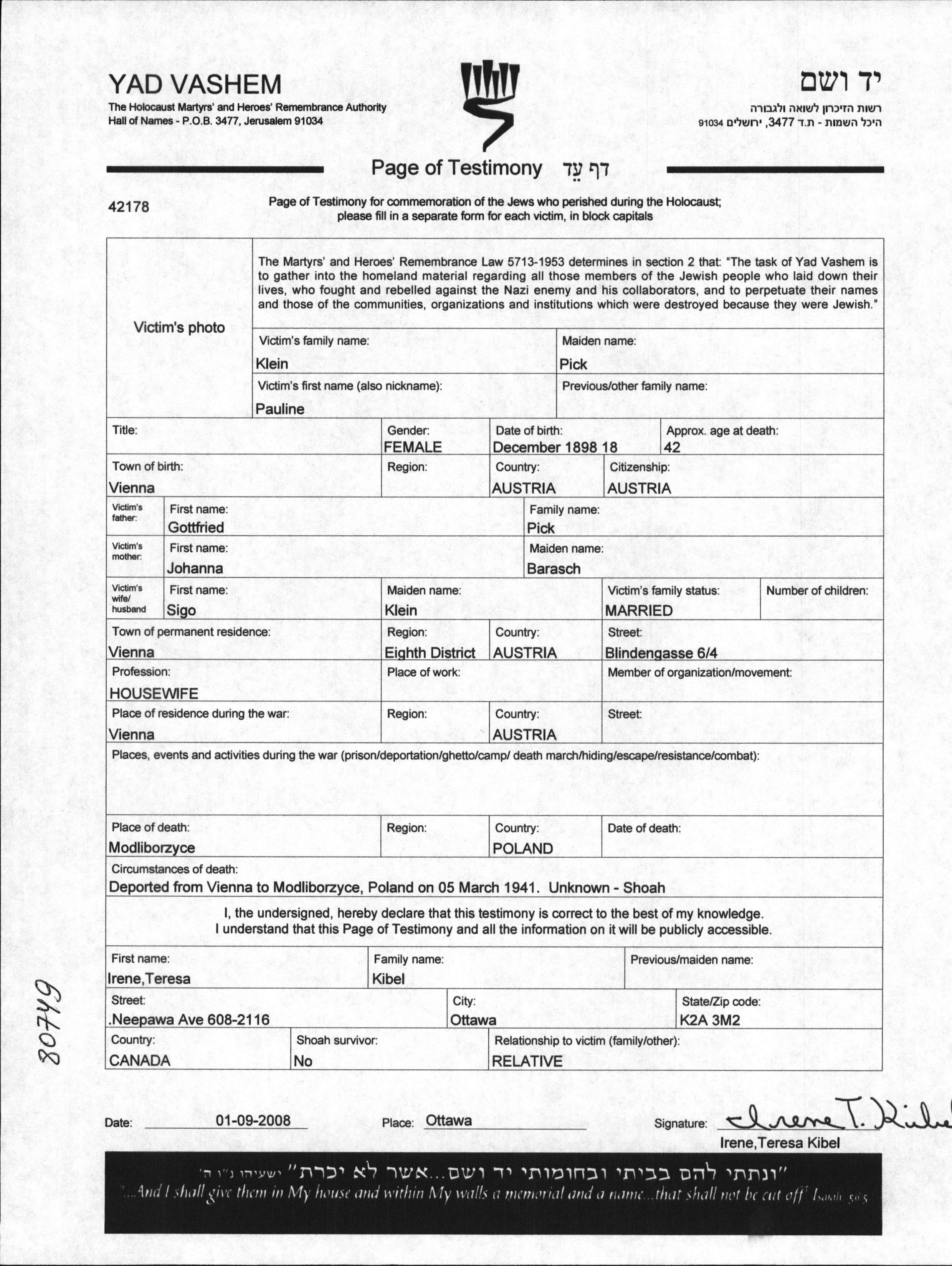 Klein Pauline 1898 Vienna, Austria Page of Testimony (digital signed)