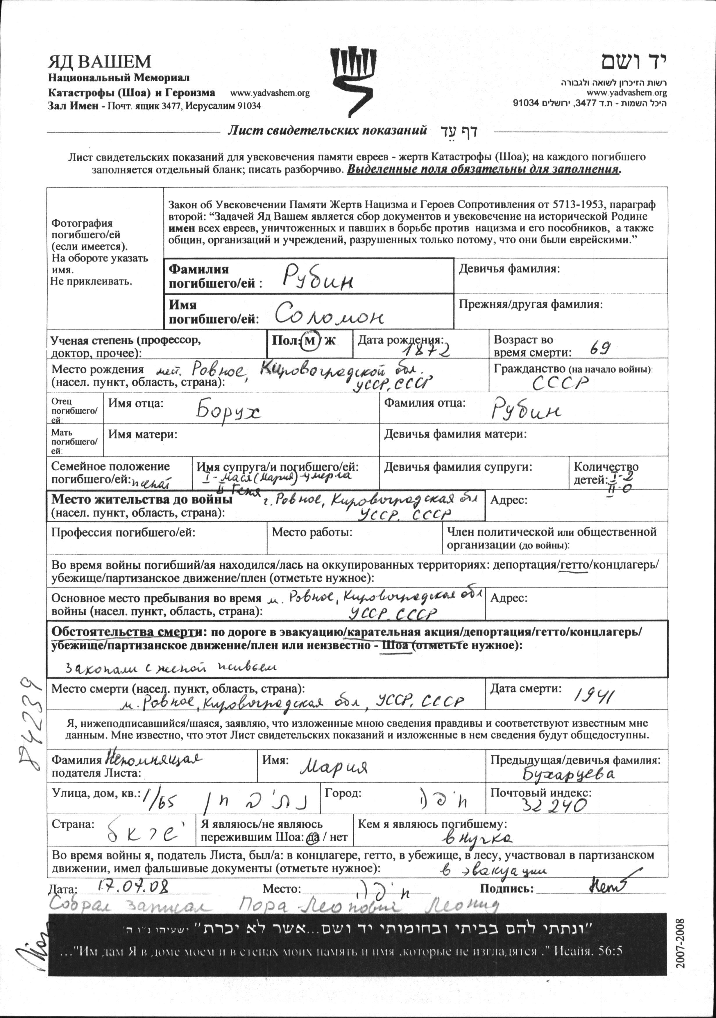 Solomon Rubin was born in Rovnoye, Ukraine (USSR), 1872 to Borukh. He was married to Genya. Prior to WWII he lived in Rovnoye, Ukraine (USSR). During the war he was in Rovnoye, Ukraine (USSR). Solomon was murdered in the Shoah. Place of death: Rovnoye, Ukraine (USSR), 1941.