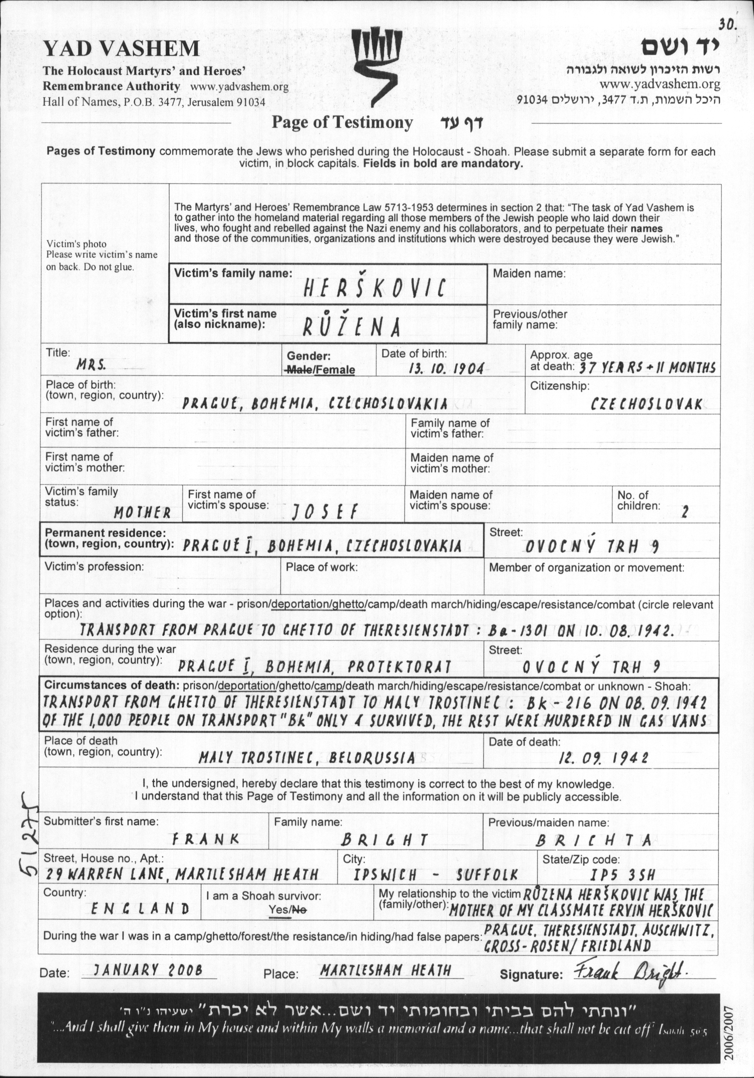 Herskovic Ruzena 1904 Prague, Czechoslovakia Page of Testimony