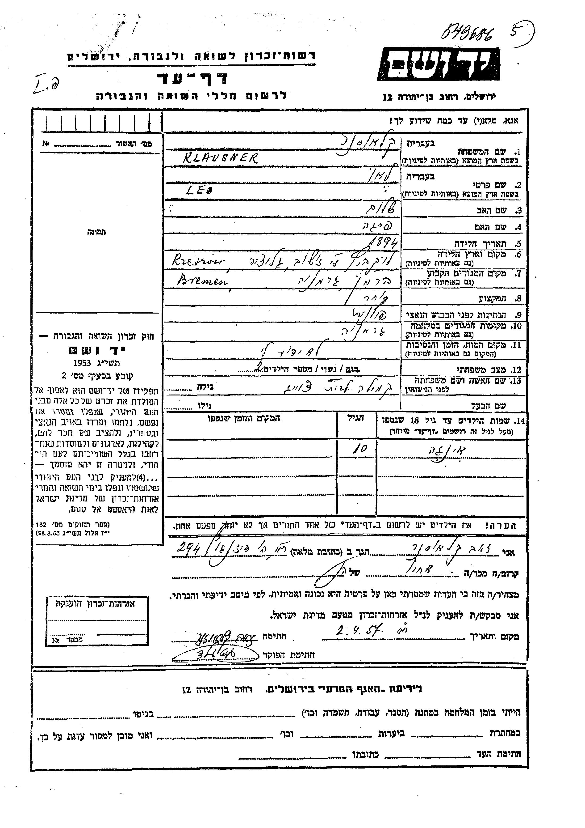 Leo Klausner was born in Rzeszow, Poland, 1894 to Shalom and Feiga. He was a merchant and married to Kamila nee Tzveig. Prior to WWII he lived in Bremen, Germany. During the war he was in Germany.