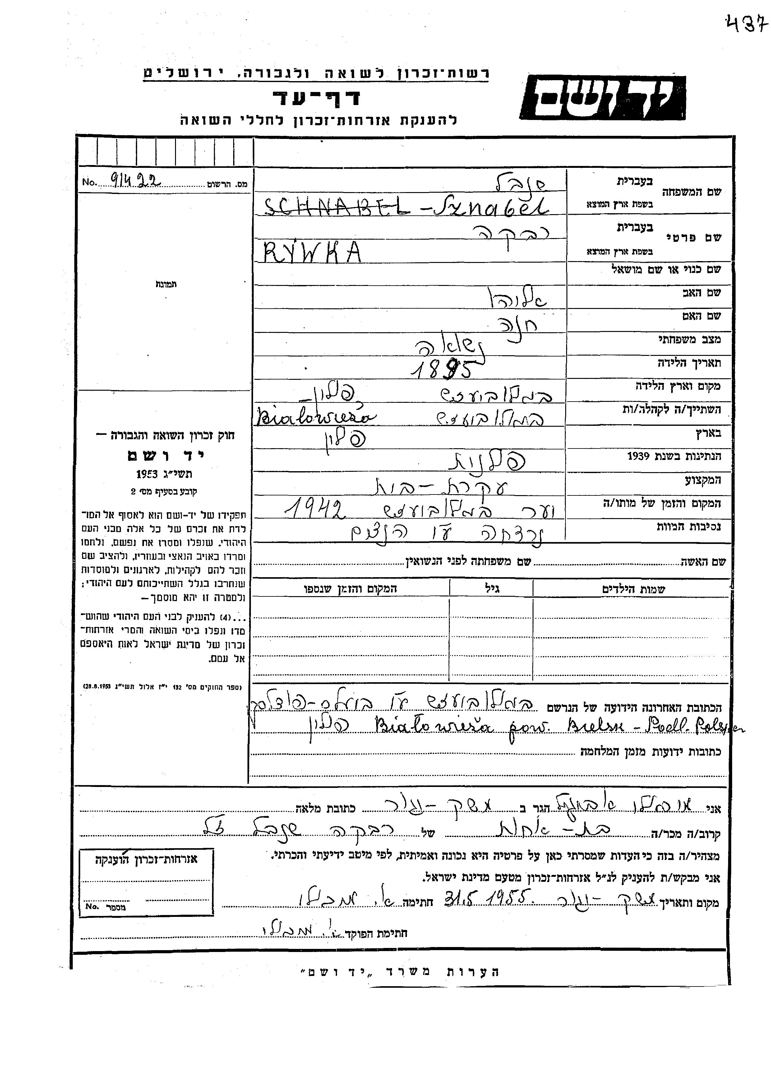 Rywka Sznabel was born in Bialowieza, Poland, 1895 to Eliahu and Khana. She was a housewife and married. Prior to WWII she lived in Bialowieza, Poland. During the war she was in Bialowieza, Poland. Rywka was murdered in the Shoah. Place of death: Bialowieza, Poland, 1942.