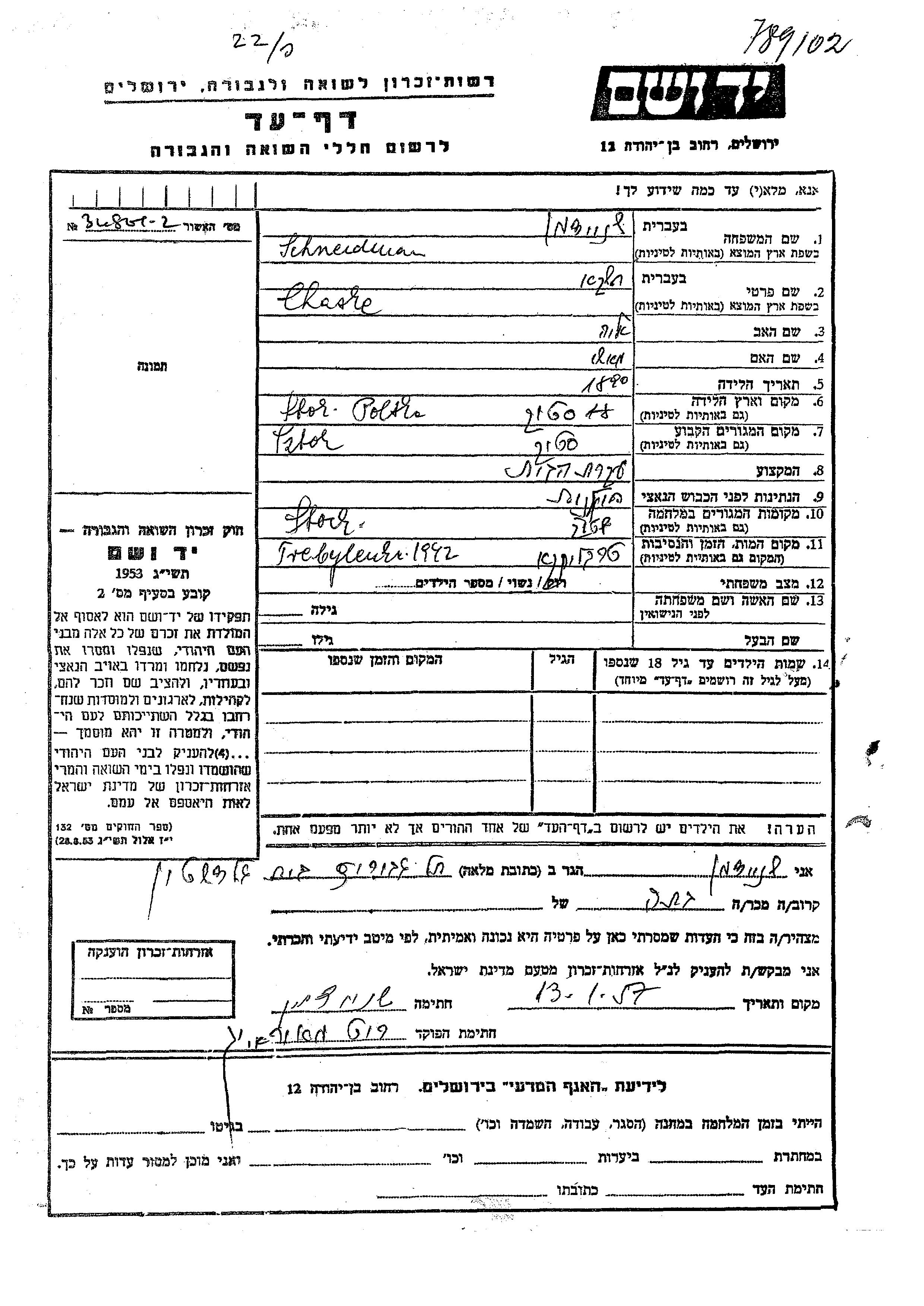 Chaske Schneidman was born in Stok, Poland, 1890 to Alia and Mashi. She was a housewife and married. Prior to WWII she lived in Stok, Poland. During the war she was in Stok, Poland. Chaske was murdered in the Shoah. Place of death: Treblinka, Poland, 1942.