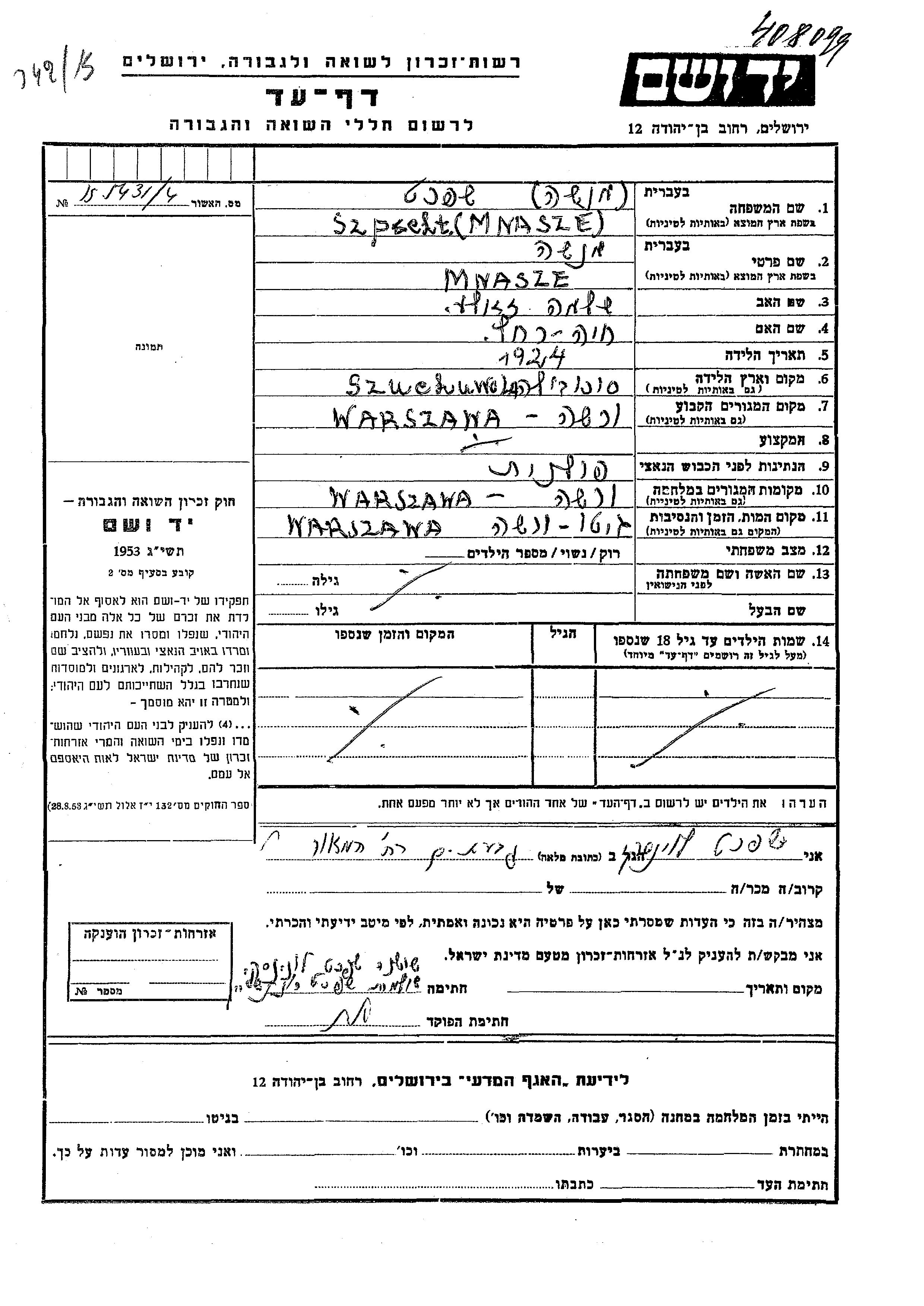 Mnasze Szpecht was born in Suchowola, Poland, 1924 to Shlomo Zale and Khaia Rakhel. Prior to WWII he lived in Warszawa, Poland. During the war he was in Warszawa, Poland. Mnasze was murdered in the Shoah. Place of death: Warszawa, Poland.