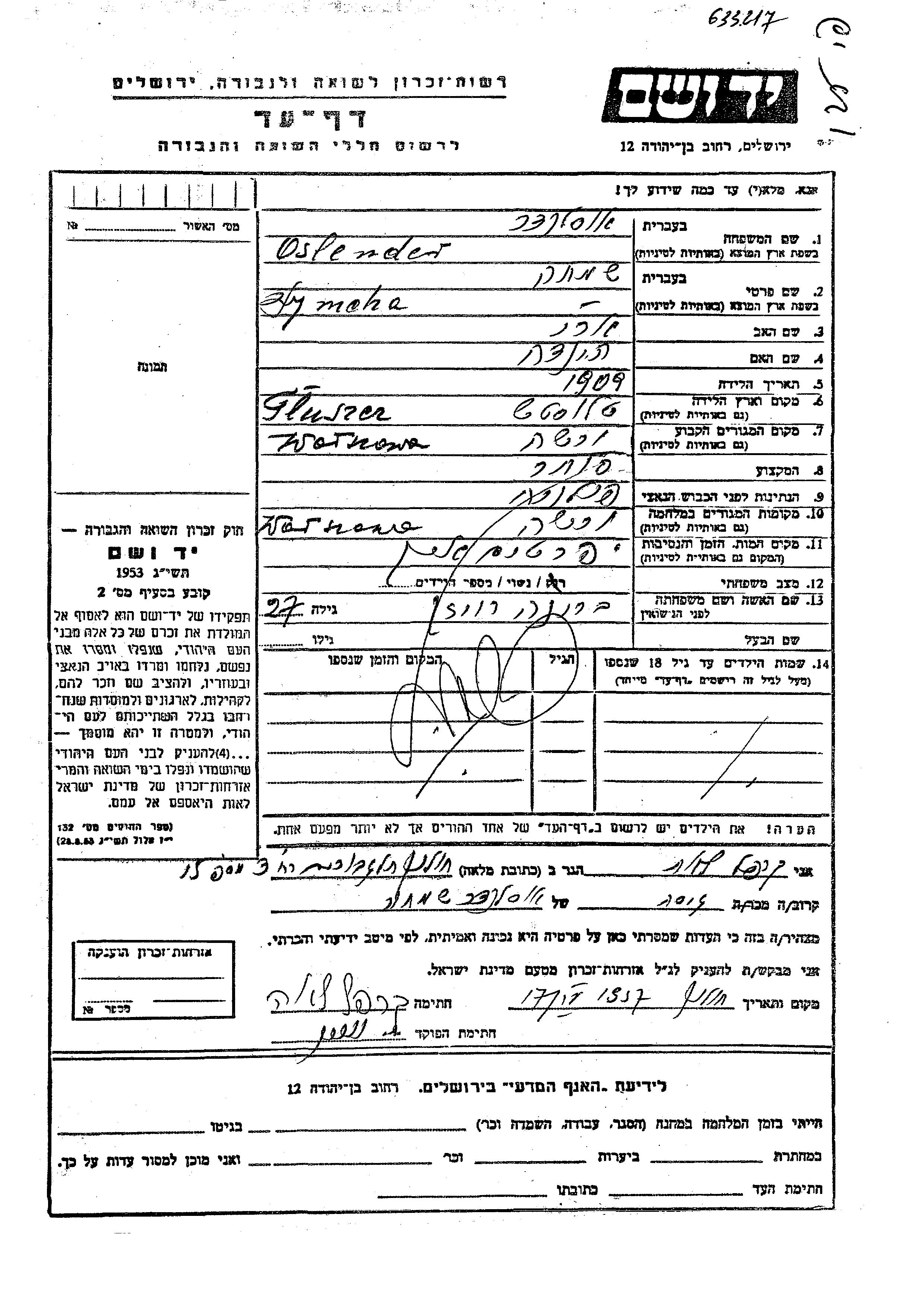 Symcha Oslender was born in Tluszcz, Poland, 1909 to Ari and Hinda. He was a merchant and married to Braina nee Roizen. Prior to WWII he lived in Warszawa, Poland. During the war he was in Warszawa, Poland. Symcha was murdered in the Shoah.