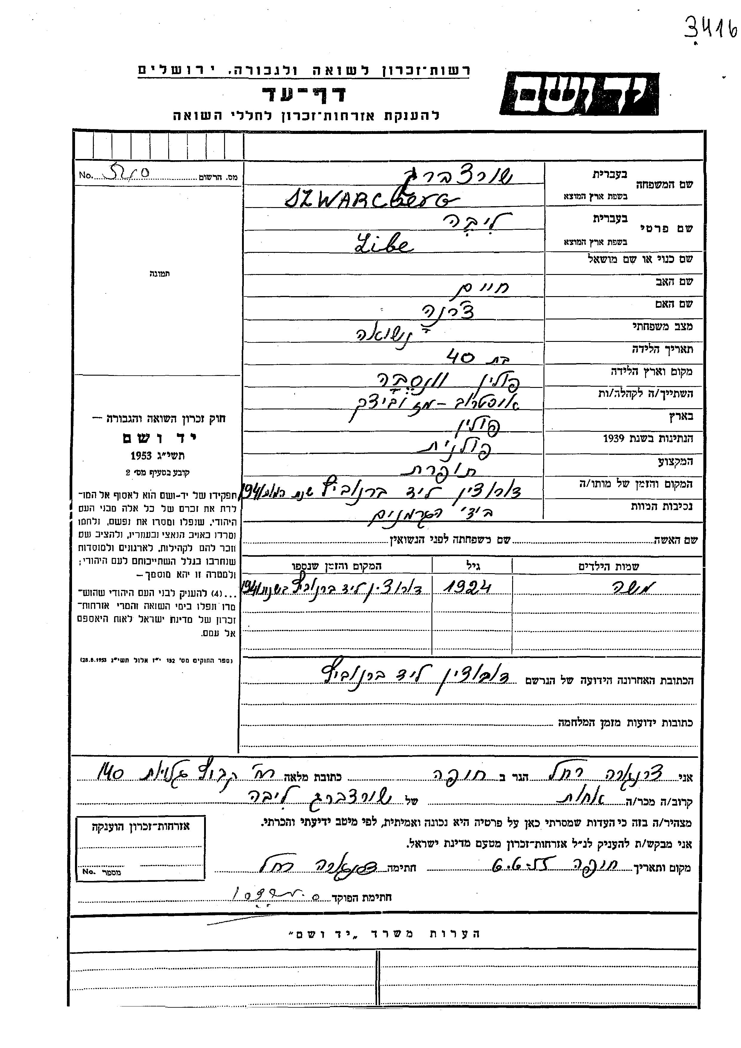 Liba Szwarcberg was born in Wasowo, Poland to Khaim and Charna. She was a seamstress and married. During the war she was in Baranowicze, Poland. Liba was murdered in the Shoah. Place of death: Baranowicze, Poland, 1941.