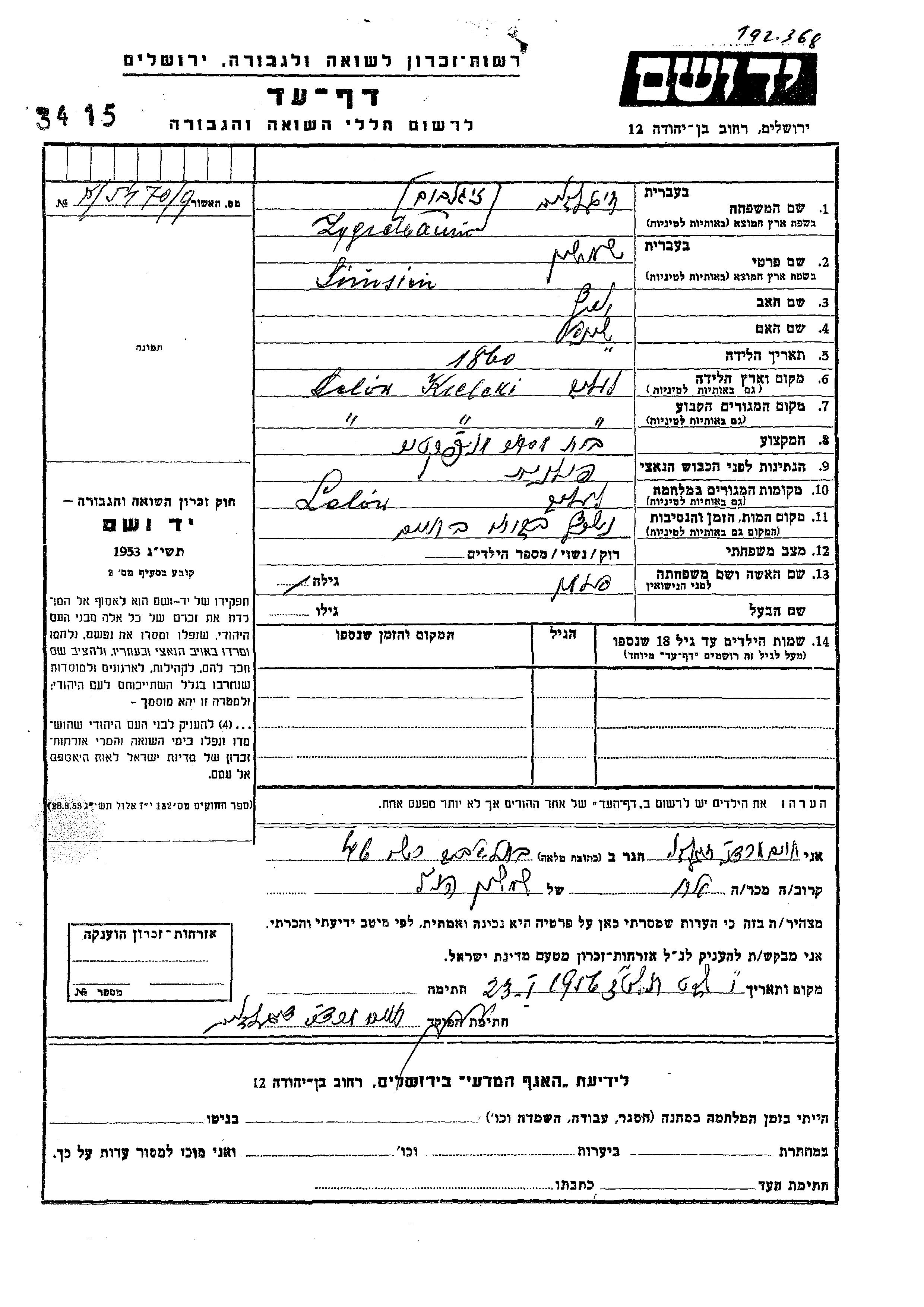Simsin Zygielbaum was born in Lelow, Poland, 1860 to Yosef and Shaina. Prior to WWII he lived in Lelow, Poland. During the war he was in Lelow, Poland. Simsin was murdered in the Shoah.