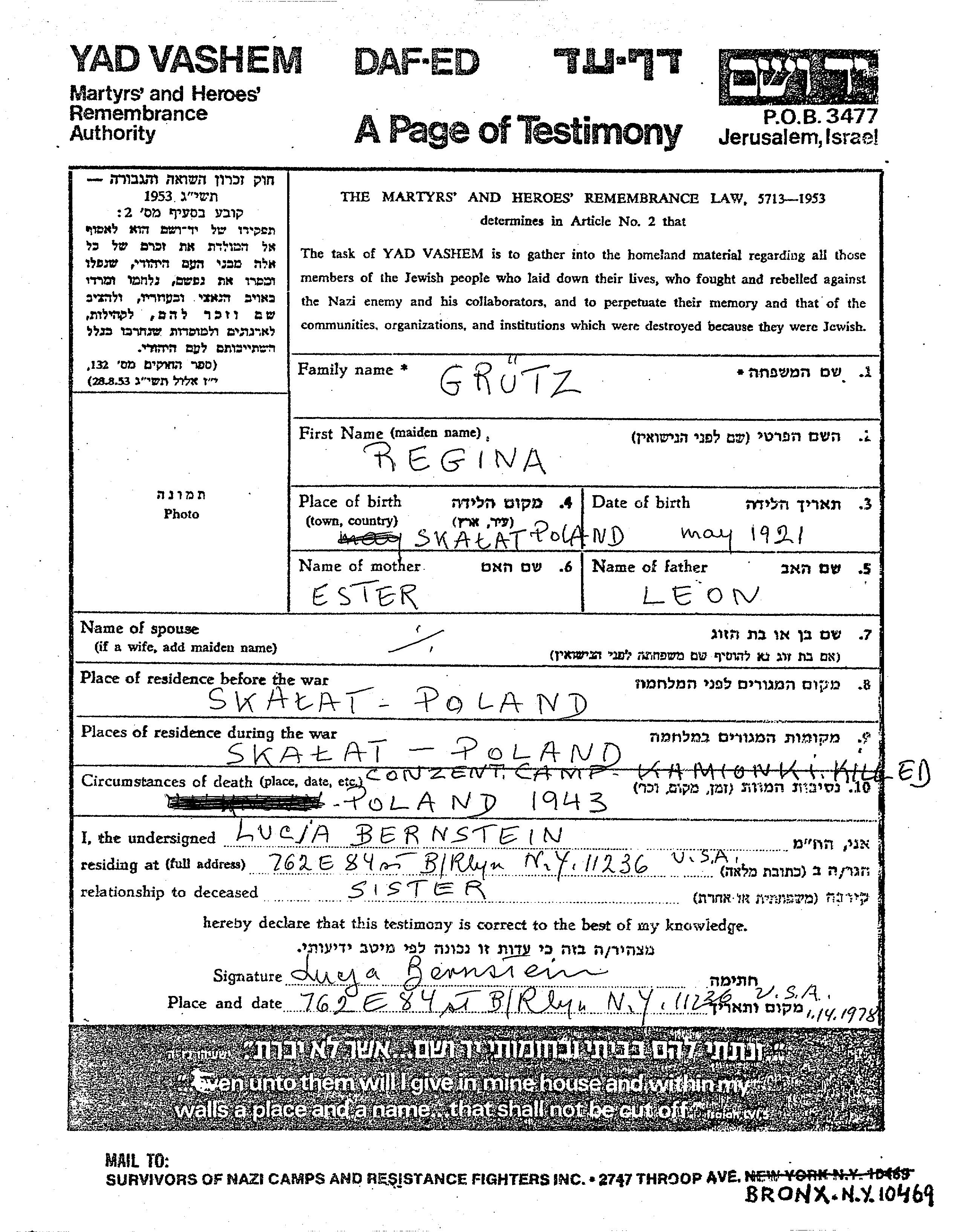 Grutz Regina 1921 Skalat, Poland Page of Testimony