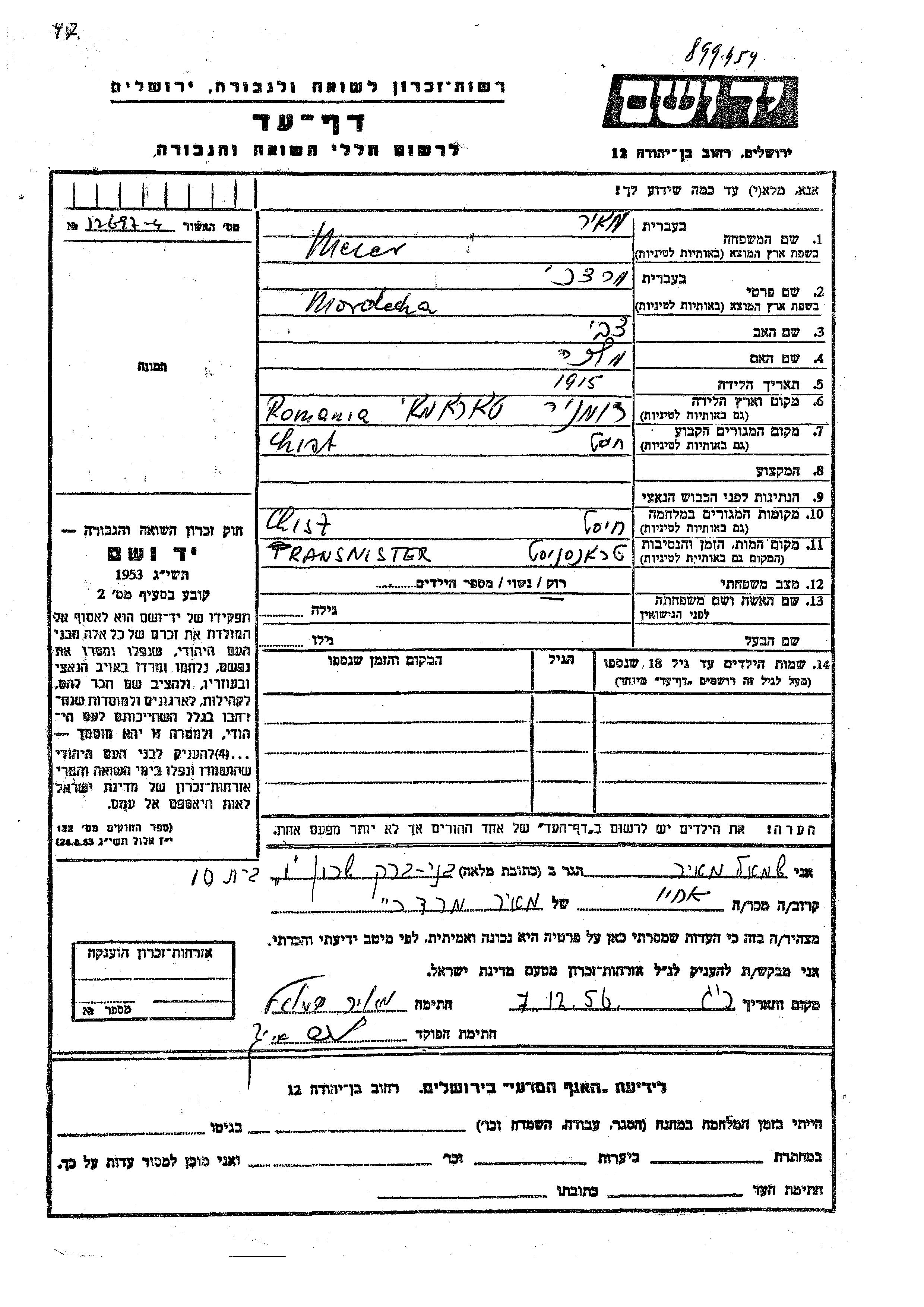 Mordecha Meier was born in Romania, 1915 to Tzvi and Malka. He was single. Prior to WWII he lived in Chist, Czechoslovakia. During the war he was in Chist, Czechoslovakia. Mordecha was murdered in the Shoah. Place of death: Transnistria, Ukraine (USSR).