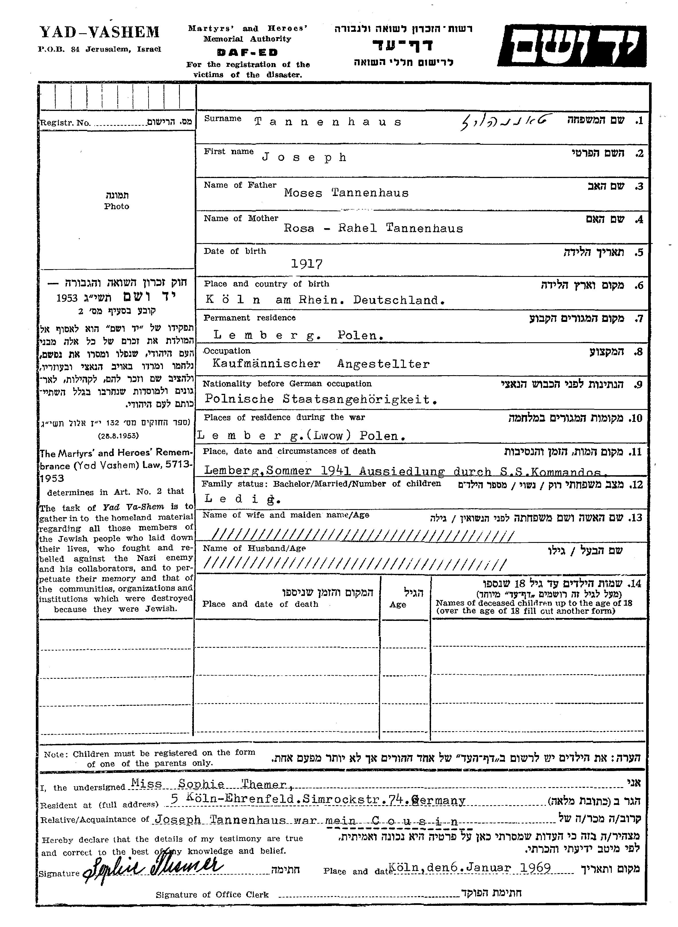 Tannenhaus Joseph 1917 Lemberg, Poland Page of Testimony